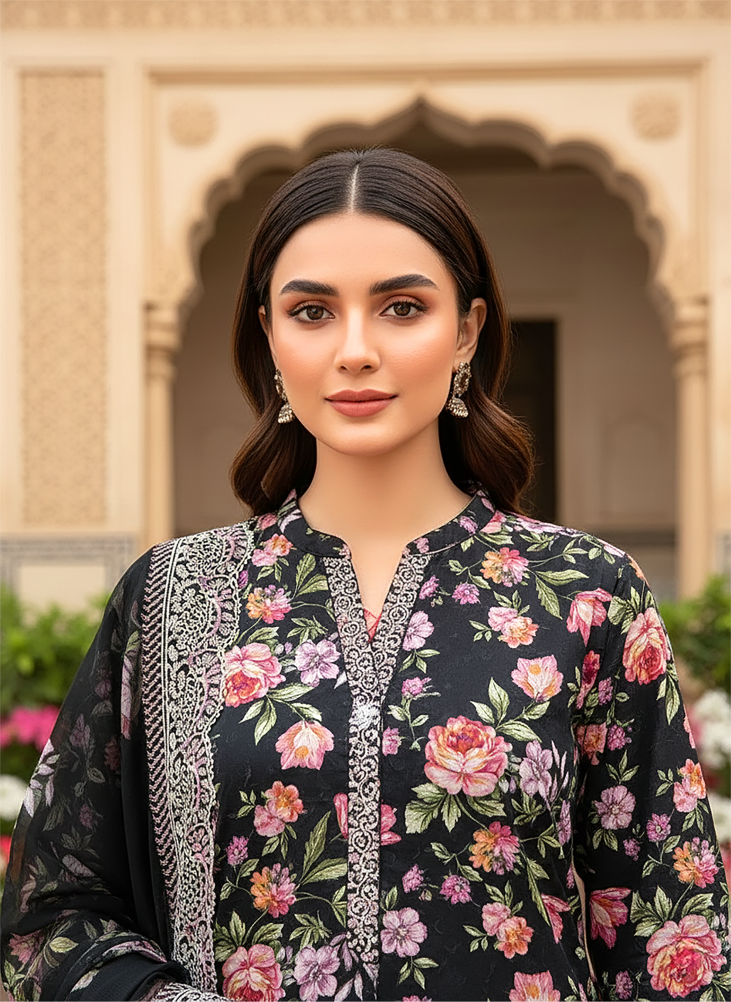 Summary: Exude sophistication this season with this exquisite Black Pakistani Lawn Suit from the Lakhany Summer collection. The main kameez is crafted from premium, breathable Lawn fabric, adorned with a captivating floral print in contrasting pinks and greens that creates a striking visual against the dark backdrop. Elevated by intricate embroidery and a delicate cutwork embroidered Chiffon dupatta, this ensemble bridges the gap between casual comfort and festive elegance. Perfectly suited for summer gatherings, Eid celebrations, or evening parties, this ethnic outfit offers a timeless look. Shop this chic unstitched dress material to add a touch of luxury to your wardrobe.