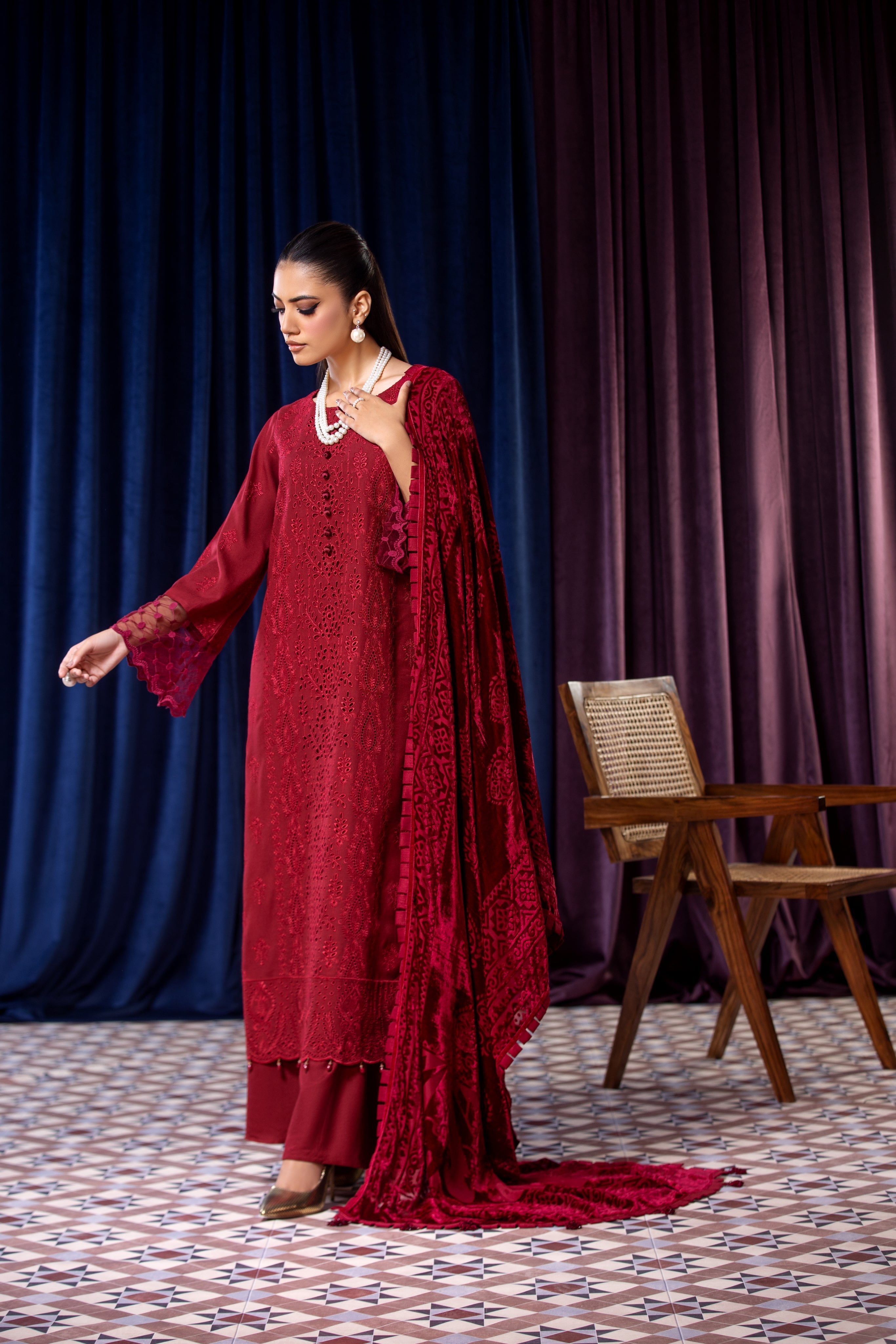 Summary: Embrace winter elegance with this stunning maroon Pakistani suit from Lala. The ensemble features a premium dyed embroidered wool kameez, offering both warmth and sophisticated style. Its rich maroon hue is perfect for the fall/winter season, making it an excellent choice for formal gatherings and wedding festivities. The shirt is beautifully detailed with tonal embroidery, adding texture and depth to the design. As a quintessential piece of ethnic wear, this unstitched wool suit provides comfort and grace, making it an ideal outfit for any formal occasion or winter celebration.