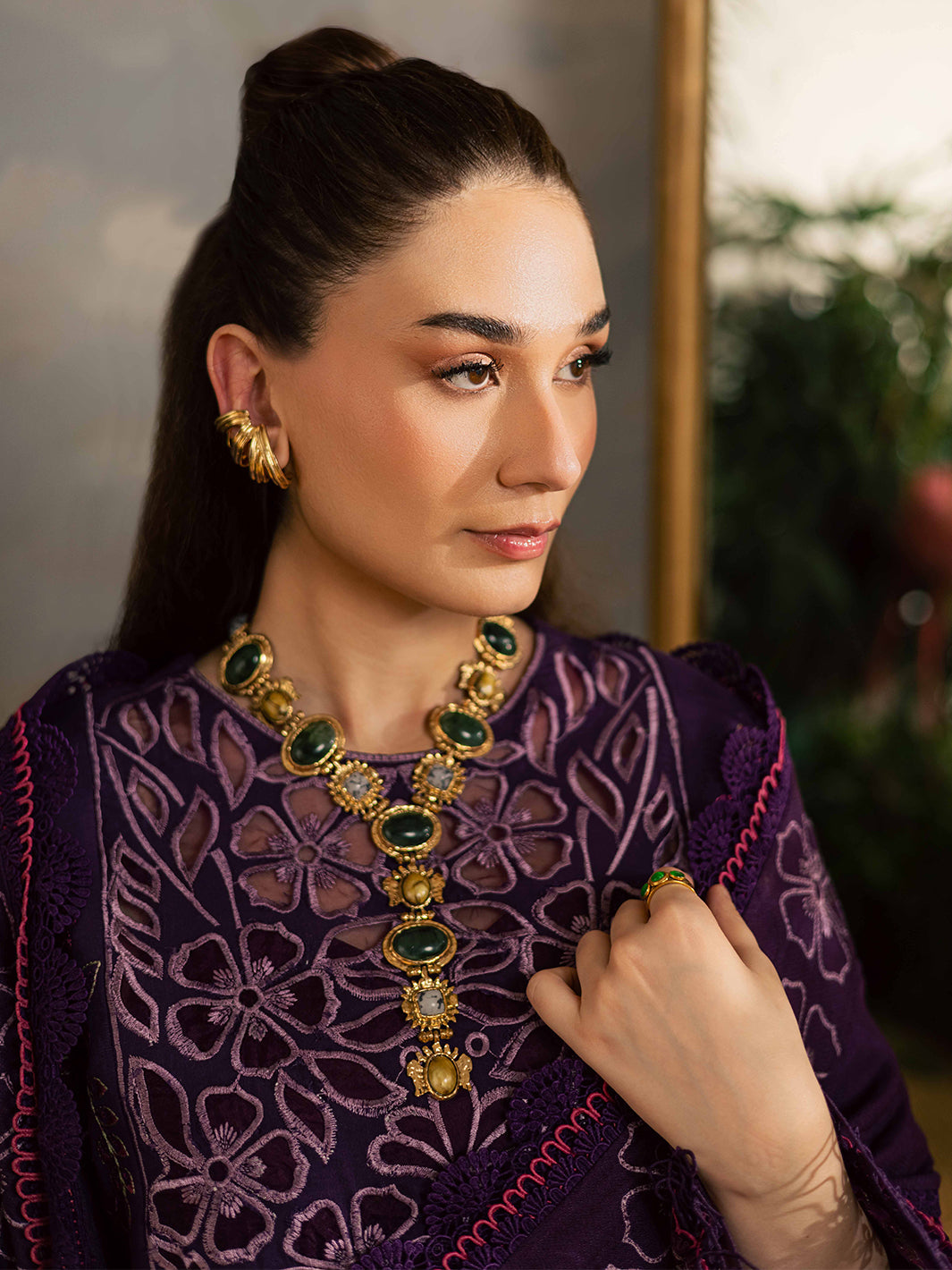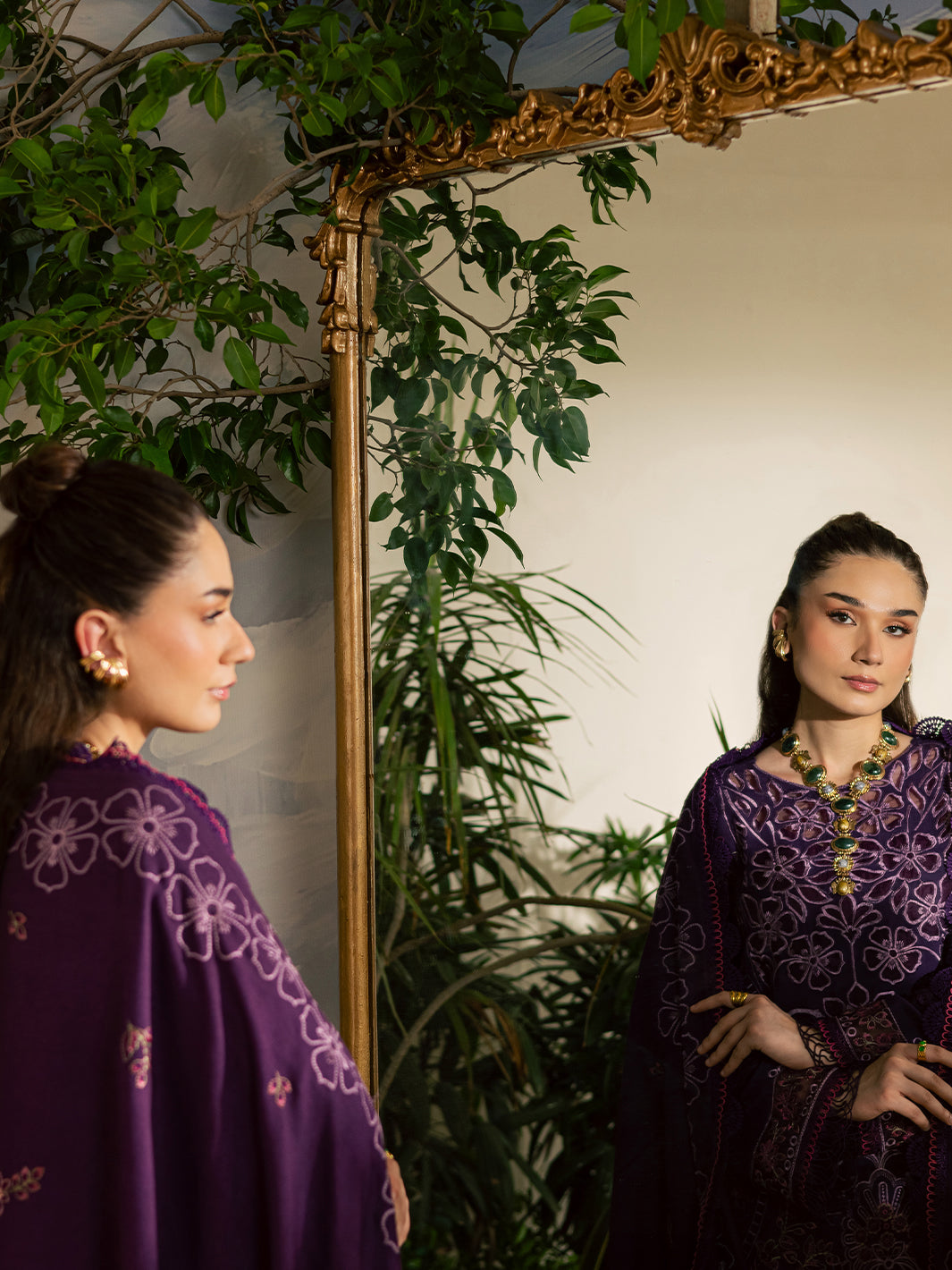 Summary: Embrace winter elegance with this stunning Mahnur Pakistani Suit in a regal purple hue. Crafted from high-quality slub linen, this unstitched dress material is designed for the Fall/Winter season, ensuring both style and warmth. The kameez is a masterpiece of design, featuring intricate laser embroidery on the front, with coordinating embroidery on the back and sleeves. Paired with a luxurious embroidered wool shawl, this ensemble is the epitome of sophisticated ethnic wear. Perfect for formal wear and festive gatherings, this outfit offers a timeless charm, making it an ideal choice for winter parties or elegant evening events.