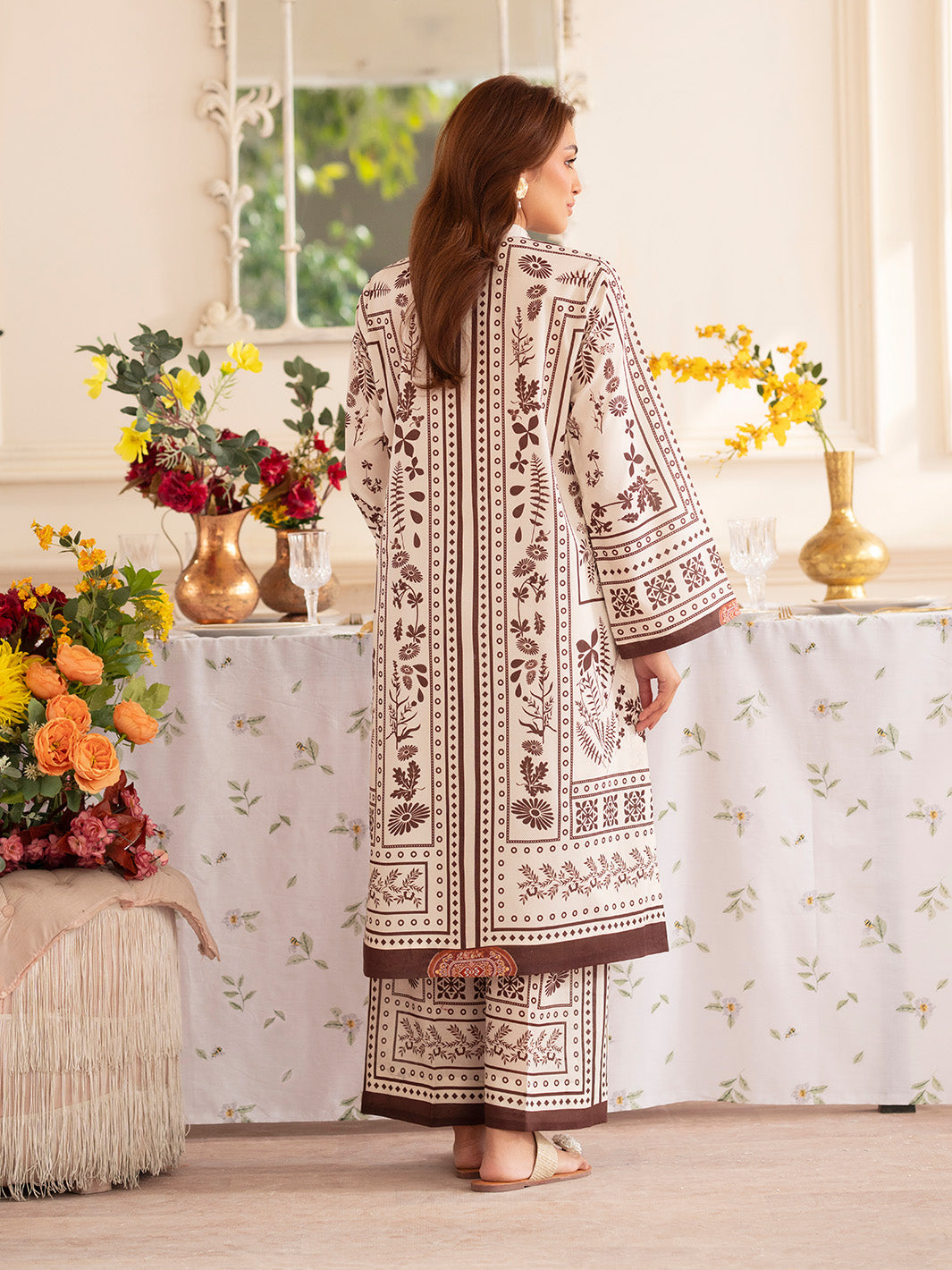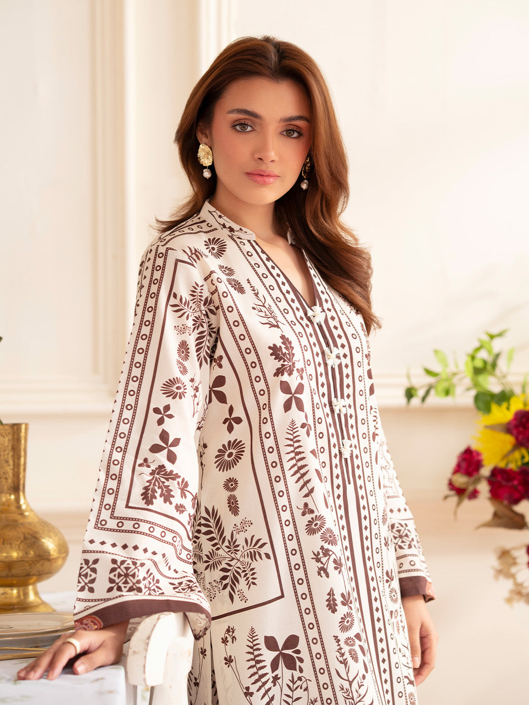Summary: Experience timeless elegance with the 'Mahnur Noir' 2-piece Pakistani Lawn Suit. This unstitched ensemble features a sophisticated Off-White canvas detailed with intricate, earthy Brown botanical and geometric prints. Crafted from high-quality lawn fabric, this Pakistani dress is exceptionally lightweight and breathable, making it an ideal choice for the Spring/Summer heat. Its classic print and versatile color palette make this summer outfit perfect for elevated daily wear or casual daytime gatherings. This ethnic wear piece offers a perfect blend of traditional design and modern comfort, making it a staple for any wardrobe.