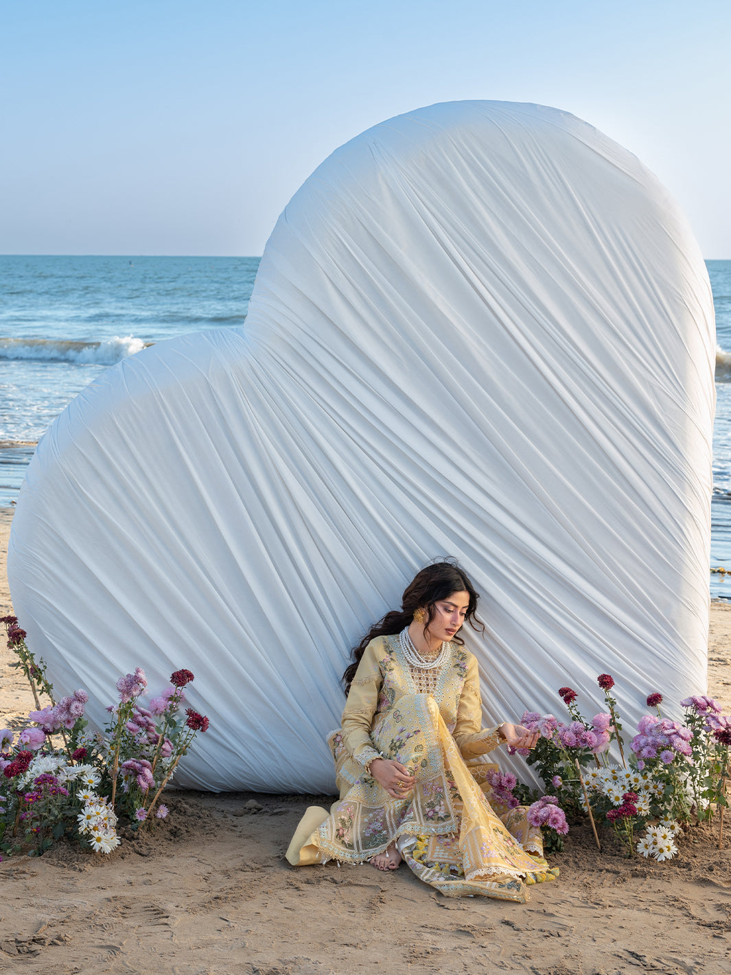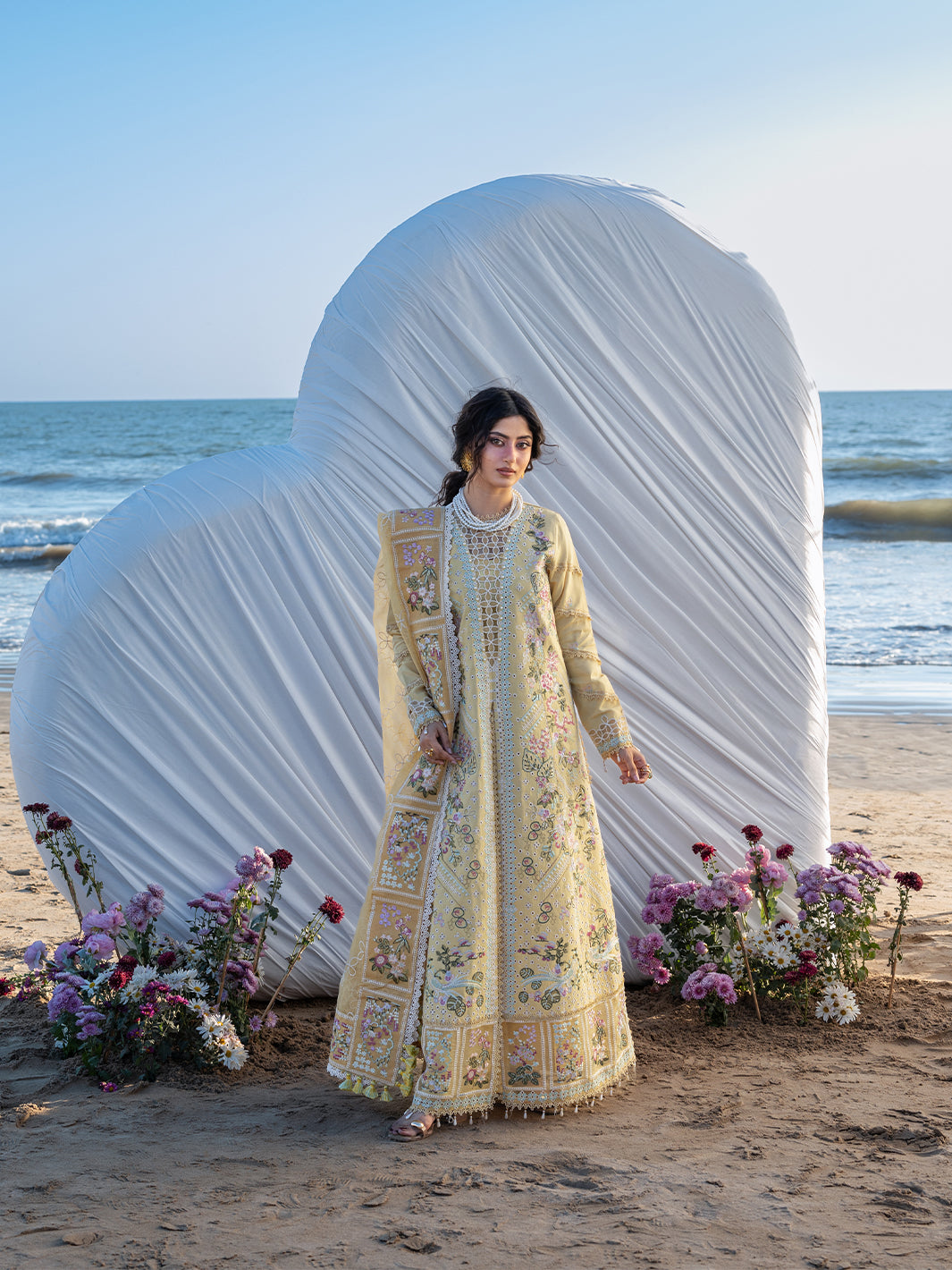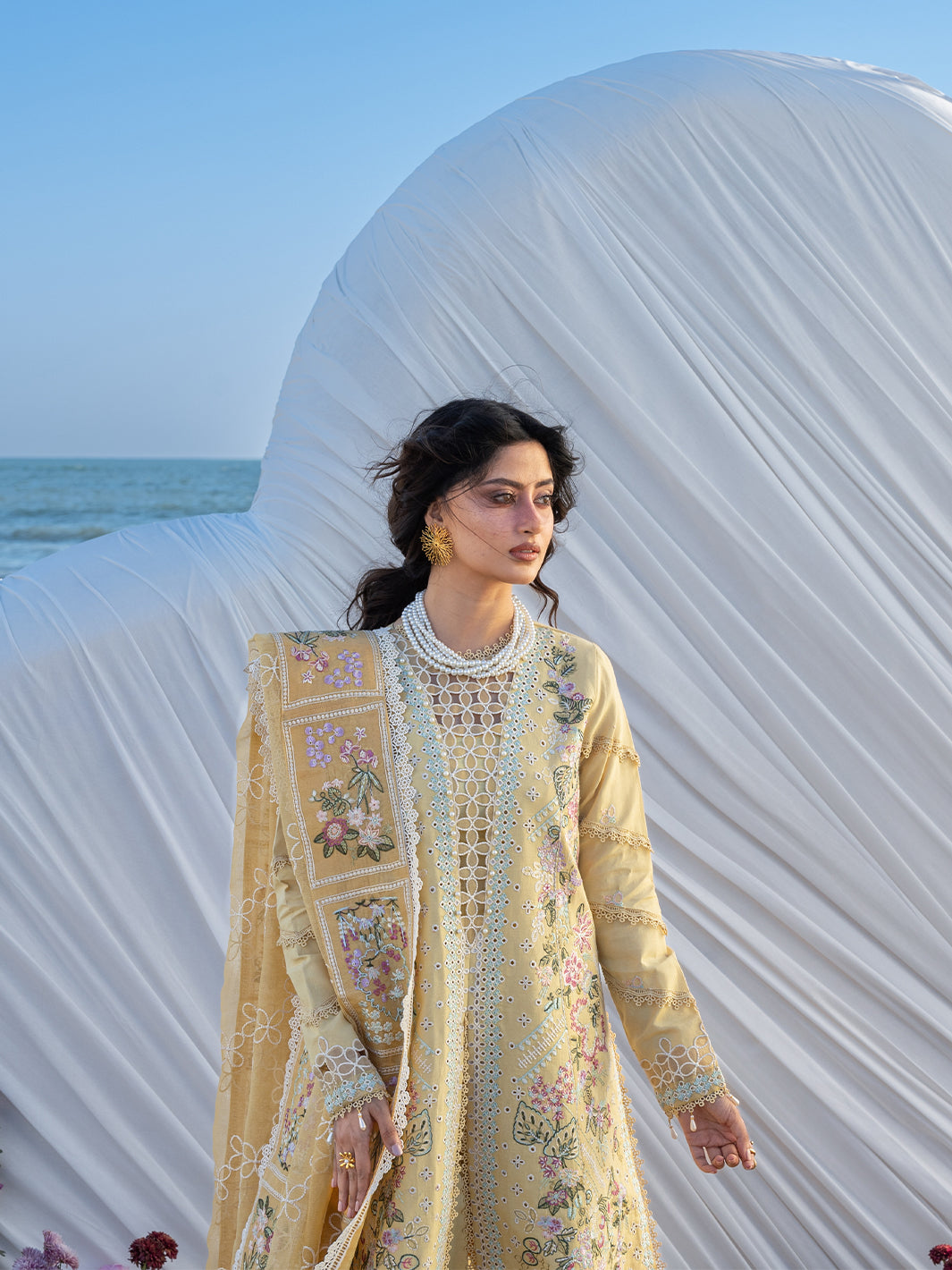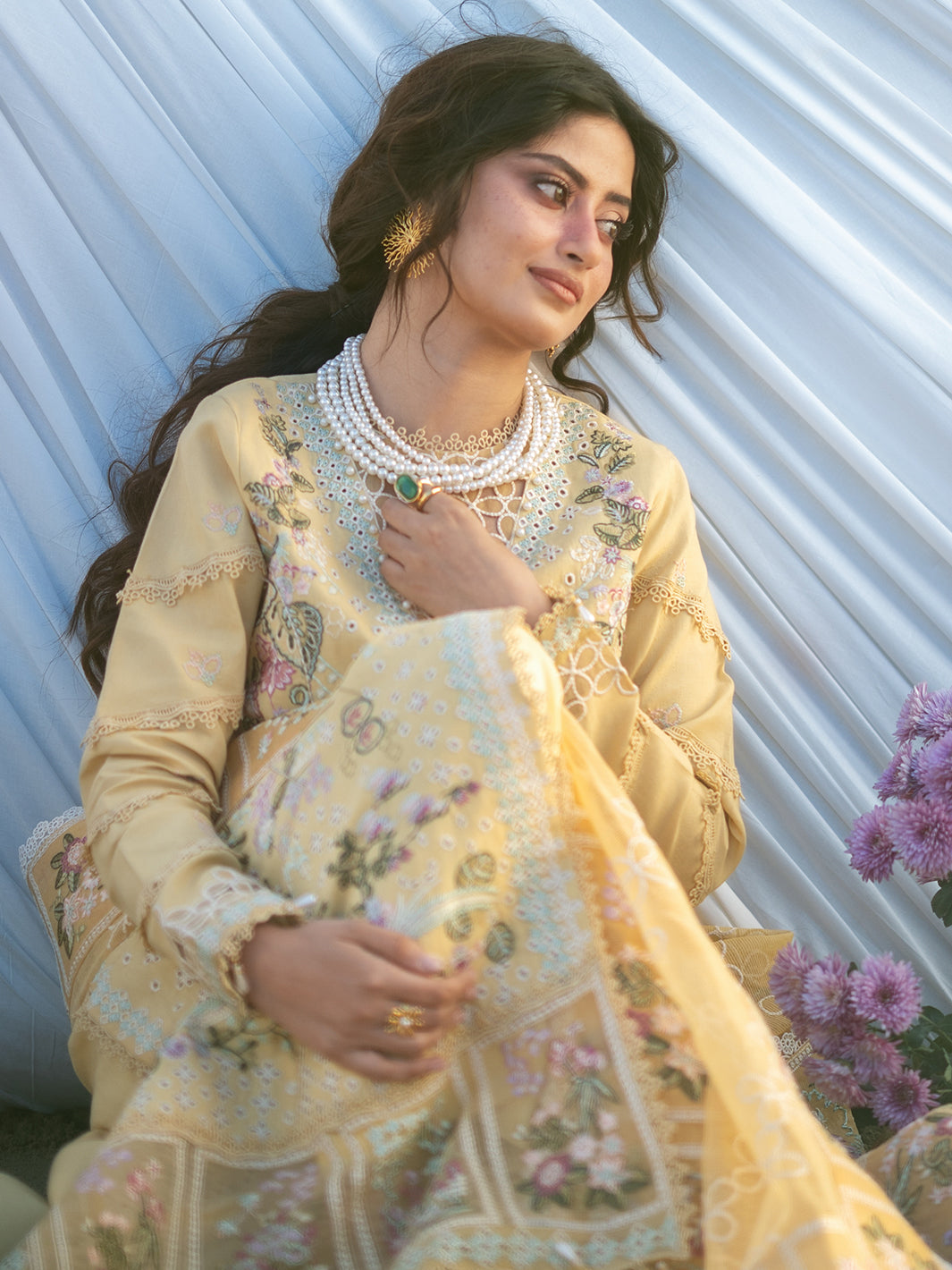 Summary: Embrace the vibrant charm of summer with the Mahnur Sirene Luxury Lawn S-02, modeled by Sajal Aly. This captivating Yellow Pakistani Suit features a premium Lawn shirt, intricately embellished with pastel floral embroidery, ensuring breathability for the Spring/Summer season. Complemented by an ethereal embroidered Net dupatta, this ensemble exudes sophistication. Perfectly curated for festive gatherings, this outfit serves as an ideal Haldi dress or a chic choice for Eid celebrations. Its sunny hue and detailed craftsmanship make it a standout in ethnic wear. Whether for a daytime wedding event or a formal lunch, this unstitched dress offers versatile styling. Shop this elegant outfit to redefine your festive wardrobe.