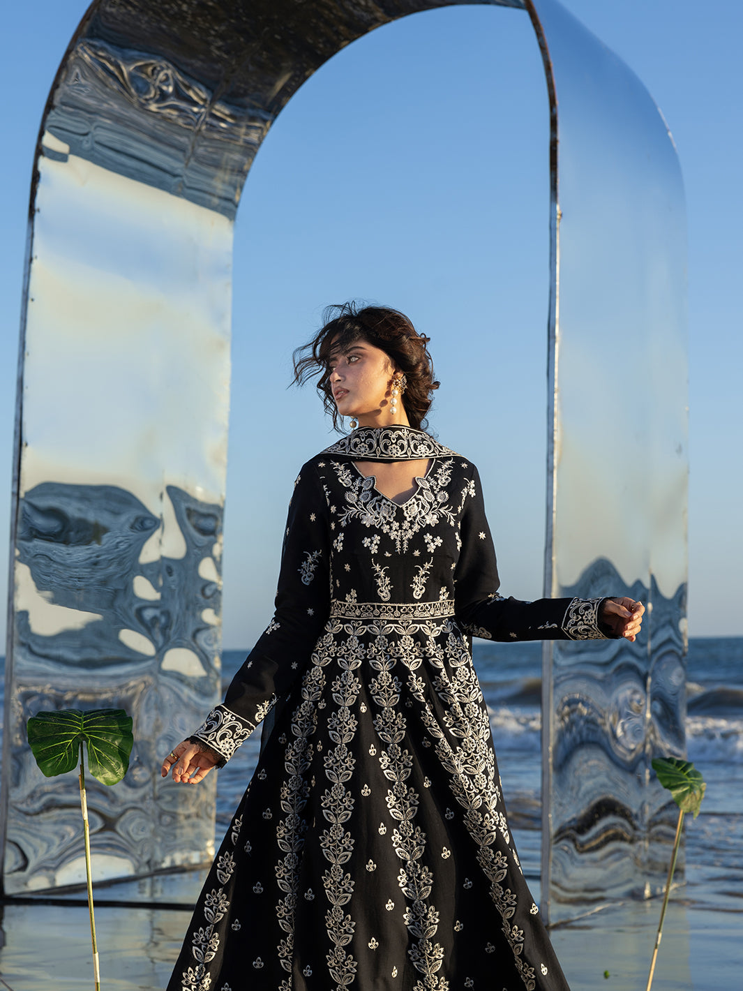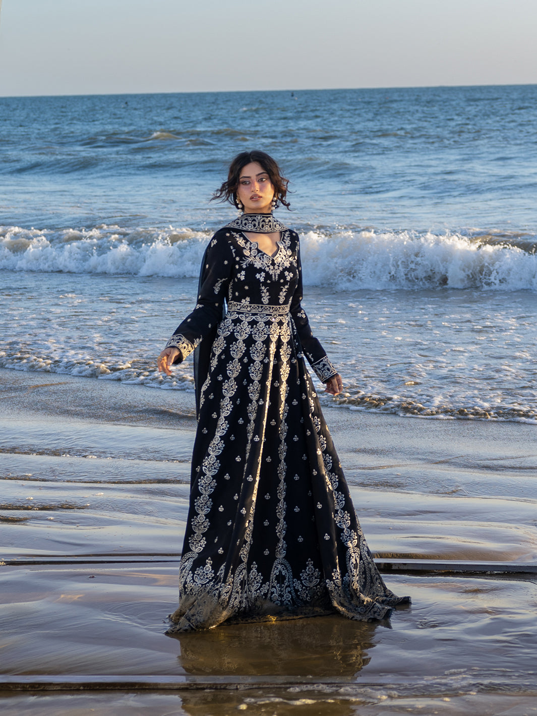 Summary: Radiate timeless sophistication in this Black Pakistani Suit from the Mahnur Sirene Luxury Lawn collection (S-05). Crafted from premium Lawn fabric, this dress features a flared silhouette with embroidered kalis, making it ideal for summer festive wear. The striking black canvas is adorned with exquisite white floral threadwork, offering a monochromatic look perfect for evening parties and formal dinners. Paired with a sheer embroidered Chiffon dupatta, this ensemble combines breathable comfort with ethnic luxury. Whether for a chic Eid outfit or a graceful wedding guest look, this unstitched dress material is a must-have. Shop this stunning Pakistani lawn dress online for effortless elegance.