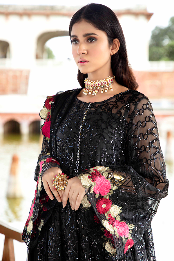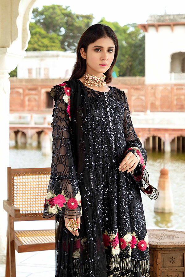 Fabric: Embroidered chiffon for frock: 2.50 yards Embroidered organza border for frock: 2.50 yards Embroidered chiffon for sleeves: 0.75 yard Embroidered organza border for sleeves: 1.25 yards Embroidered chiffon for dupatta: 2.75 yards Dyed raw silk for trousers: 2.50 yards Embroidered organza border for trousers: 2 yards |