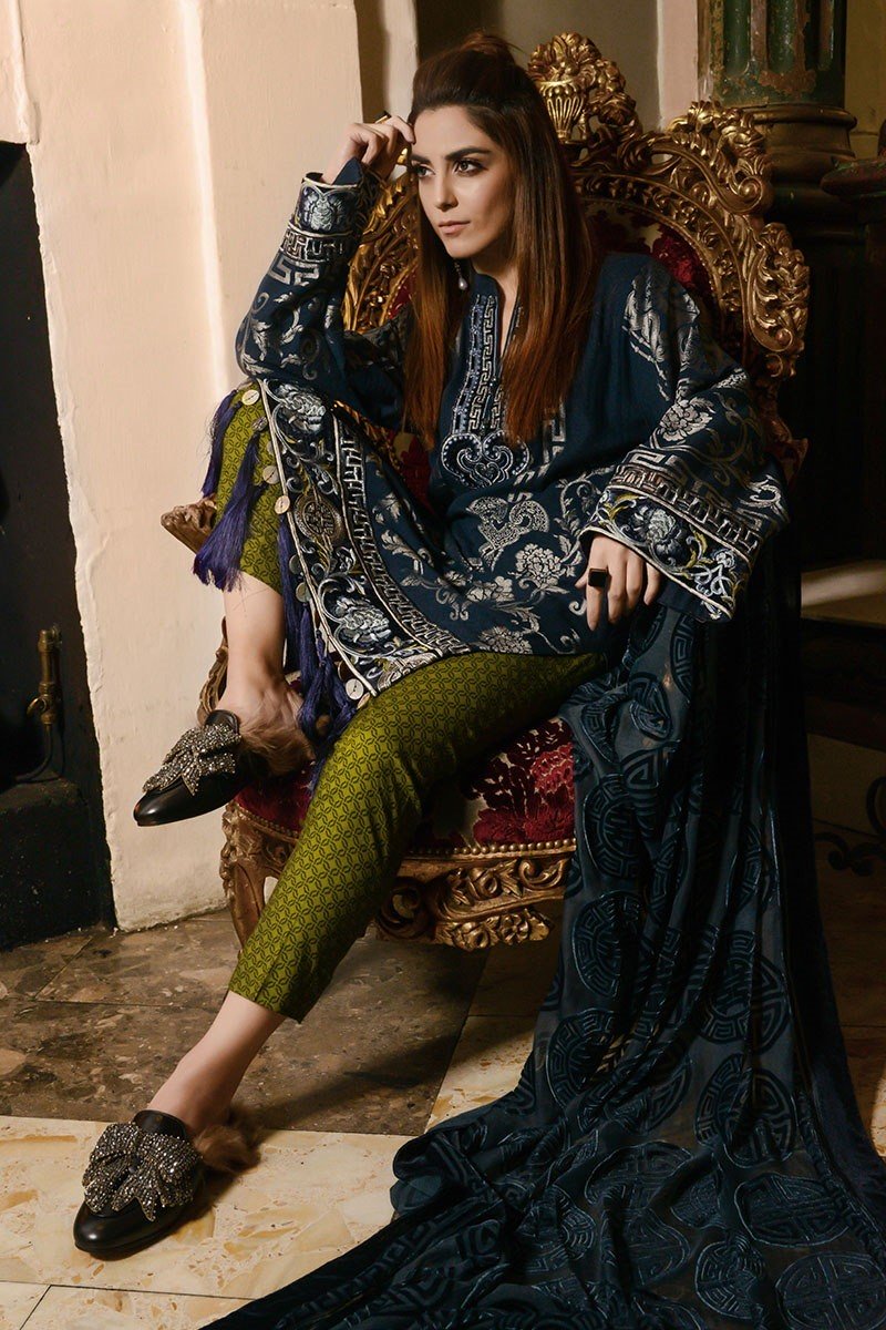 Fabric: Jacquard Front: 1.25 Meter Printed Linen Back: 1.25 Meter Jacquard Sleeves: 0.65 Meter Printed Linen Trouser: 2.5 Meter Plushy Dupatta: 2.5 Meter Embroidered Velvet Neckline: 1 Piece Embroidered Velvet Ghera Patti: 1 Meter Embroidered Velvet Sleeve Patti: 1 Meter Embroidered Organza Patti 2 Meter Ornate Buttons |