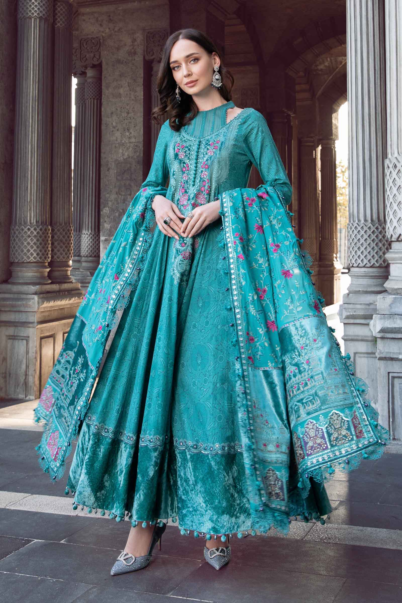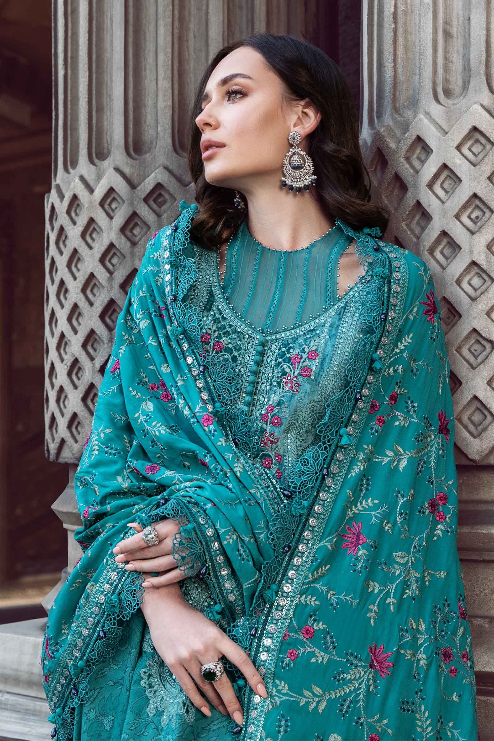 Fabric: This dress is a symbol of class, featuring a printed embroidered shirt with embroidered shawl and dyed trousers. Shirt: Digital Printed Shirt Embroidered Velvet Neckline Embroidered Velvet Sleeves Patti Embroidered Velvet Front & Back Ghera Patti Fabric: Twill Linen Trousers: Dyed Trousers Fabric: Linen Dupatta: Embroidered Linen Shawl with Palu Patti |