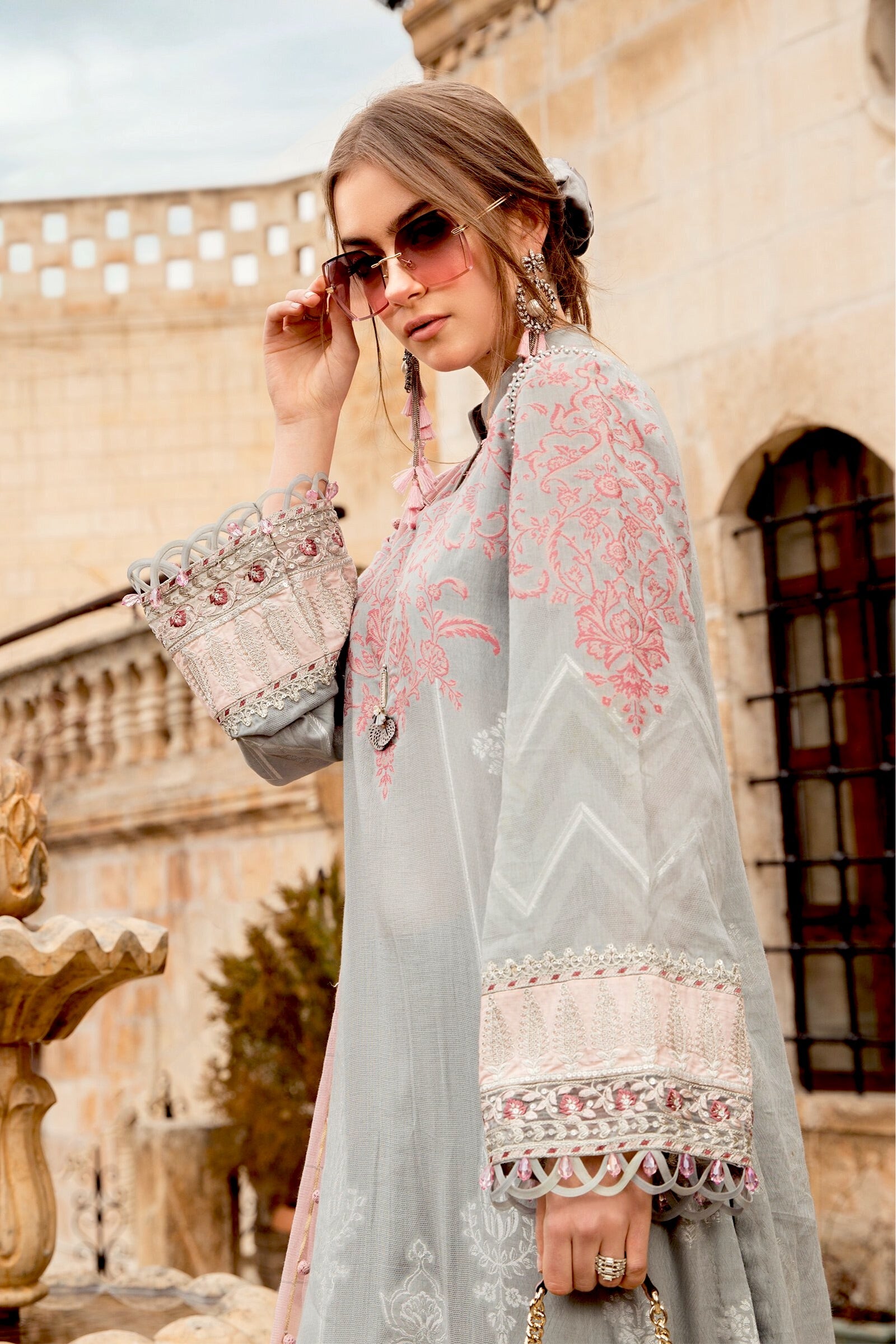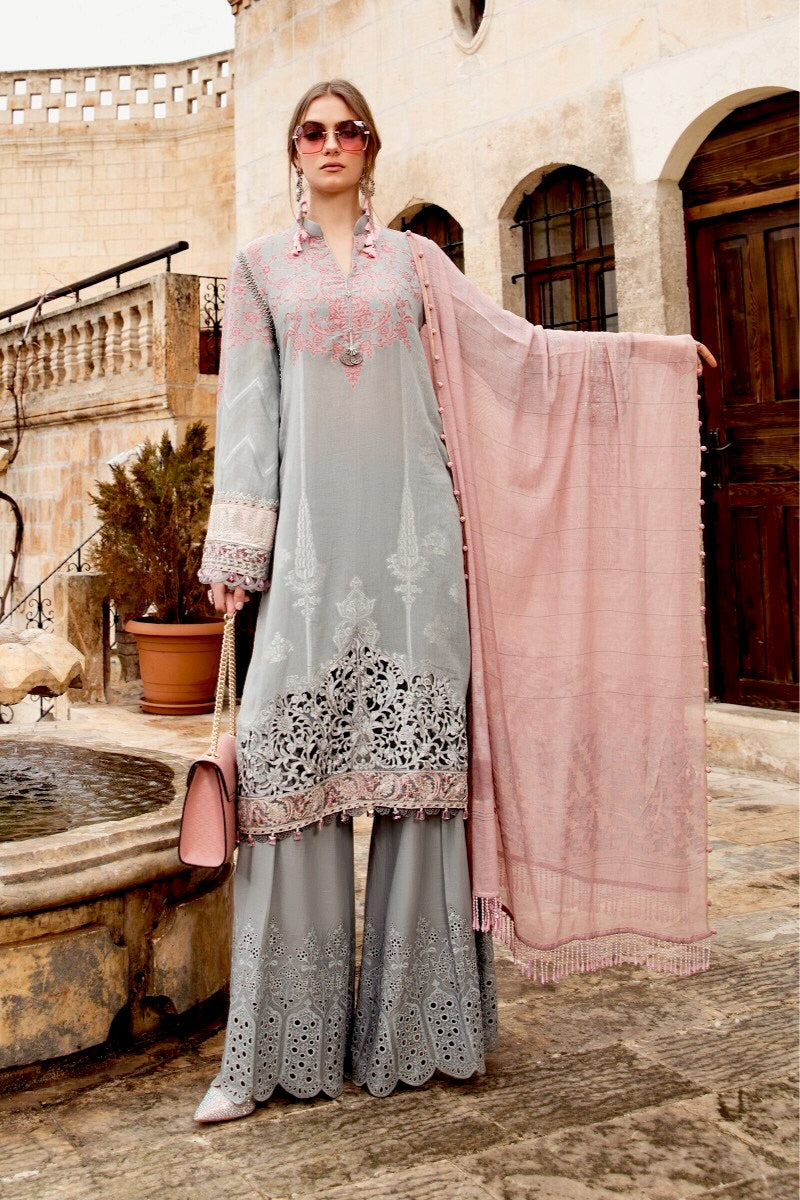 Fabric: Jacquard Shirt Khaddi dupatta Embroidered trouser Embroidered organza sleeve Lace I Embroidered sleeves lawn Lace II Embroidered organza sleeve lace III Embroidered ghera organza Lace Embroidered organza ghera patch |