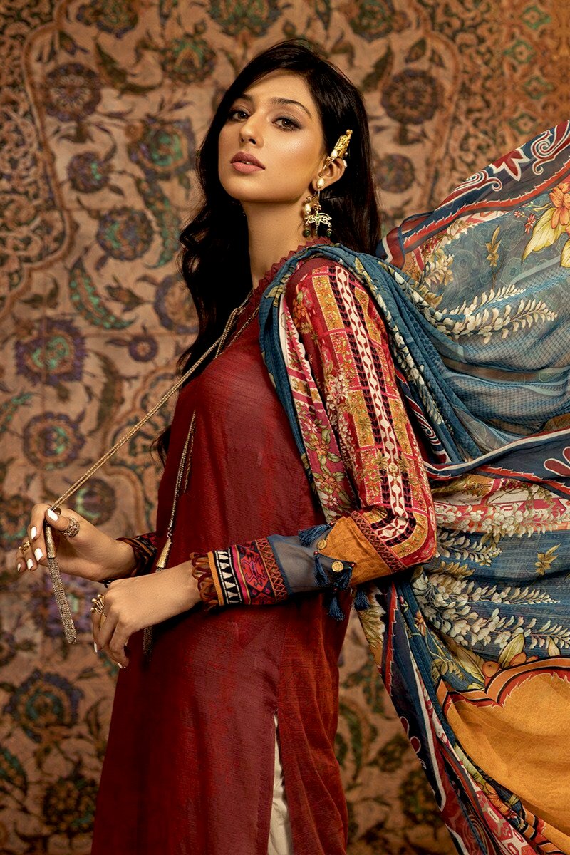 Fabric: Printed khaddar shirt Linen dobby trouser Printed chiffon dupatta Embroidered patti |