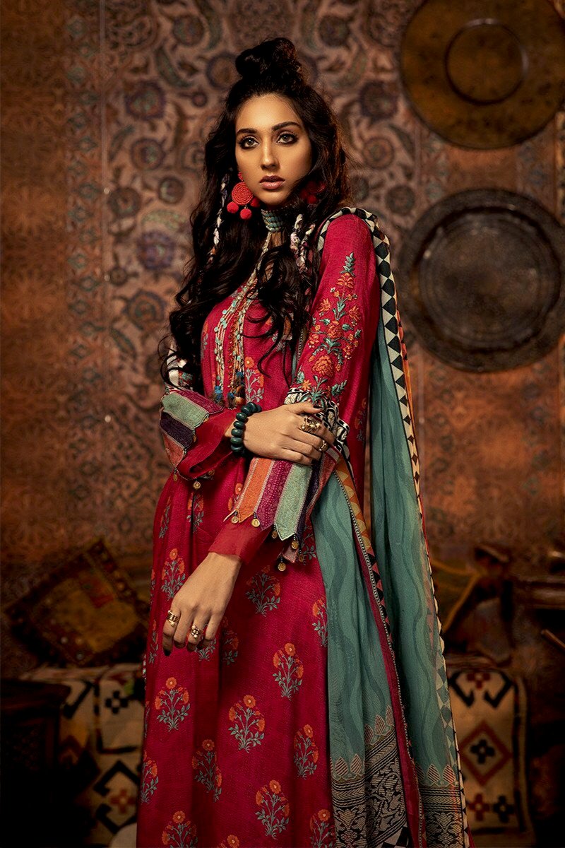 Fabric: Printed linen dobby shirt Printed linen dobby trouser Printed chiffon dupatta Embroidered neckline patti Embroidered sleeve patches |