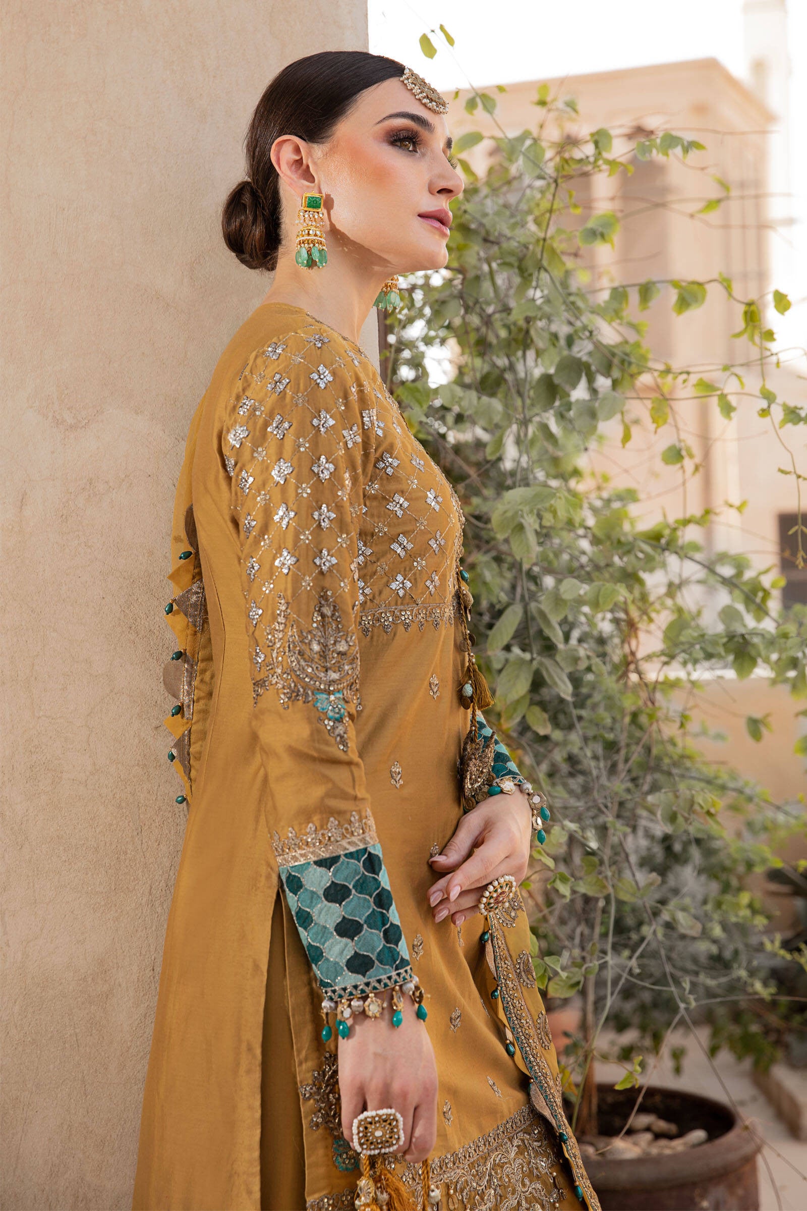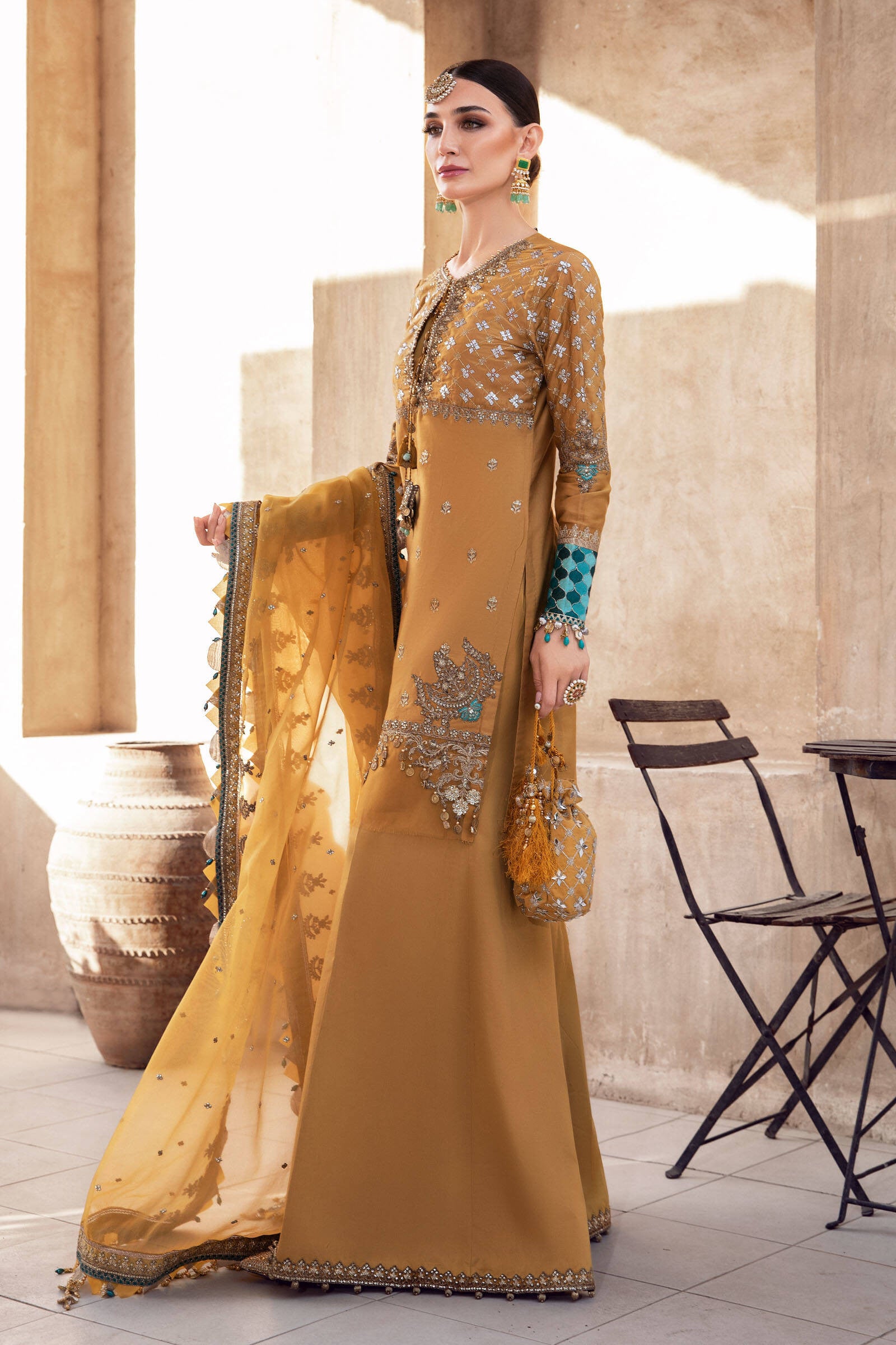 Fabric: Embroidered Cotton Satin Front Embroidered Cotton Satin Front Yoke Embroidered Cotton Satin Sleeves Lace Embroidered Cotton Satin Sleeves Plain Cotton Satin Back Embroidered Cotton Satin Dupatta Lace Embroidered Organza Dupatta Embroidered Organza Tassels Embroidered Organza Ghera Patch Embroidered Organza Front Patch left & right Embroidered organza neck and patti Plain Cotton Satin trouser |