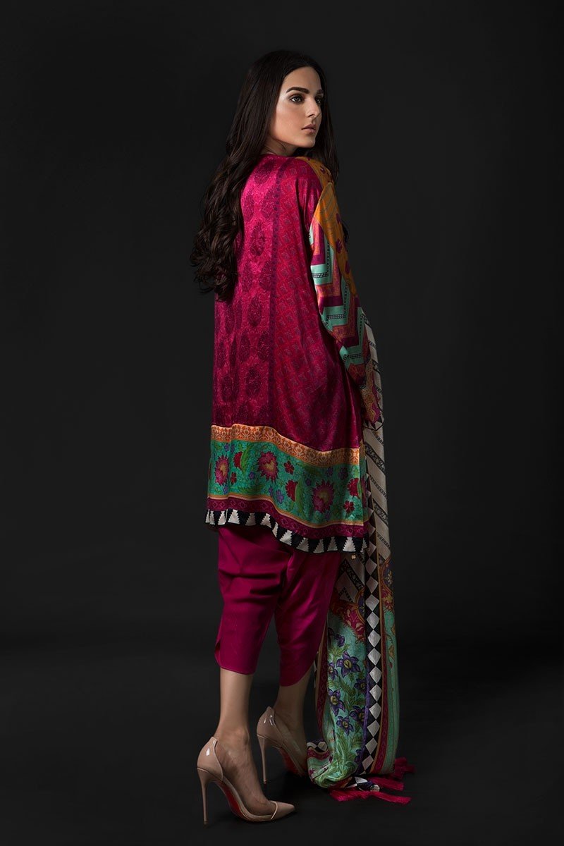 Fabric: Digital Printed Pure Charmeuse Silk Front And Back 2.5 M Sleeves 0.65 M Digital Printed Silk Dupatta 2.5 M Dyed Cotton Satin Trouser 2M Embellished Neckline 1Pc Embellished Velvet Neckline Patch 1Pc |