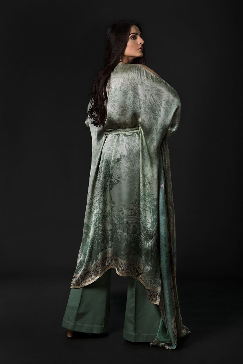 Fabric: Digital Printed Pure Charmeuse Front And Back 2.5 M Sleeves 0.65 M Digital Printed Silk Dupatta 2.5 M Dyed Cotton Satin Trouser 2M Embellished Shoulder Organza Patches 2 Pc |