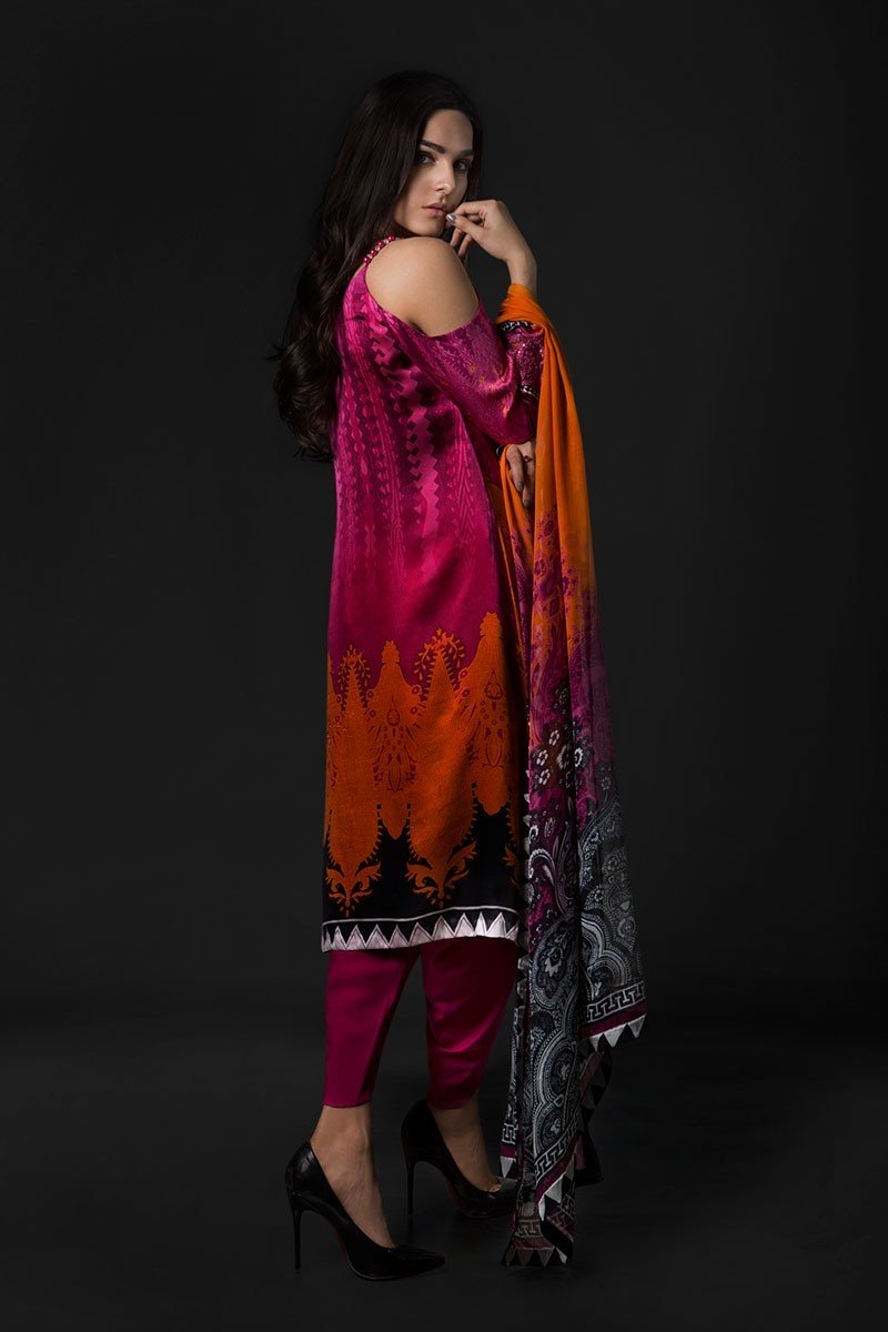 Fabric: Digital Printed Pure Charmeuse Silk Front And Back 2.5 M Sleeves 0.65 M Digital Printed Silk Dupatta 2.5 M Dyed Cotton Satin Trouser 2M Embroidered Neckline 1Pc Embroidered Sleeves Lace 1Yard |