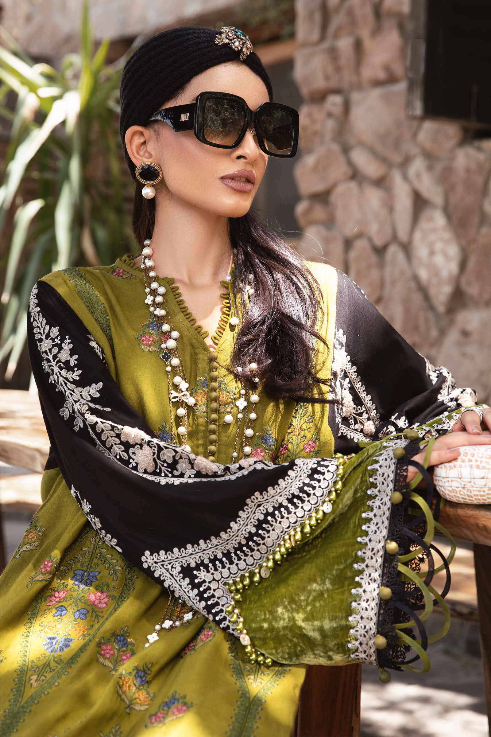 Fabric: Embroidered Linen Center Panel Embroidered Linen Side Panels Embroidered Linen Sleeves Plain Linen Back Embroidered Linen Patti For Sleeves and Ghera Dyed Linen Trouser Plain Velvet For Sleeves And Ghera Woven Shawl Embroidered Linen Shawl Patti |