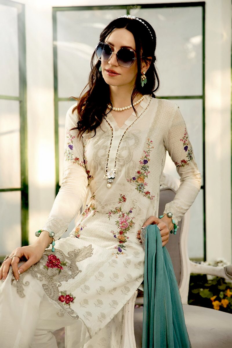 Fabric: Printed lawn shirt Cambric trouser Printed chiffon dupatta Embroidered schiffli ghera patch |