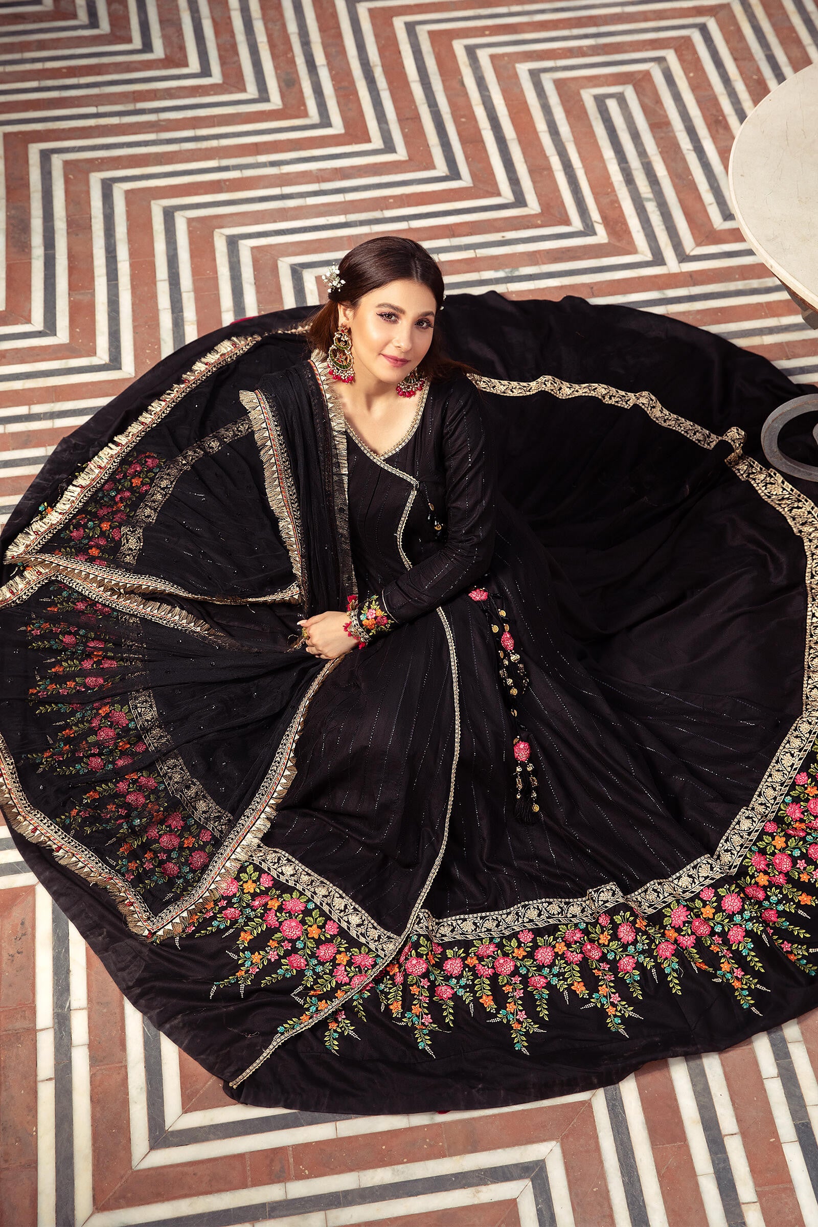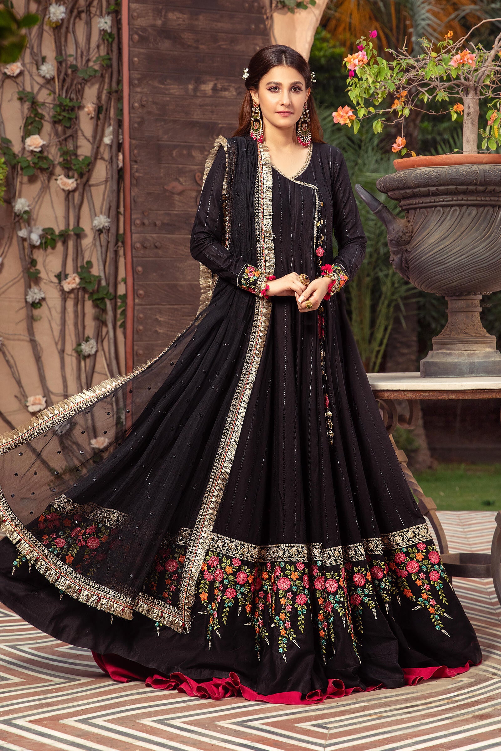 Fabric: Embroidered Cotton Satin Front & Sleeves Plain Cotton Satin Back Embroidered Cotton Satin Sleeve Patti Embroidered Net Dupatta Embroidered Velvet Dupatta Patti Plain Cotton Satin Trouser Embroidered Cotton Satin Front Ghera Lace Embroidered Cotton Satin Back Ghera Lace Embroidered Cotton Satin Neck Lace Embroidered Tassels |