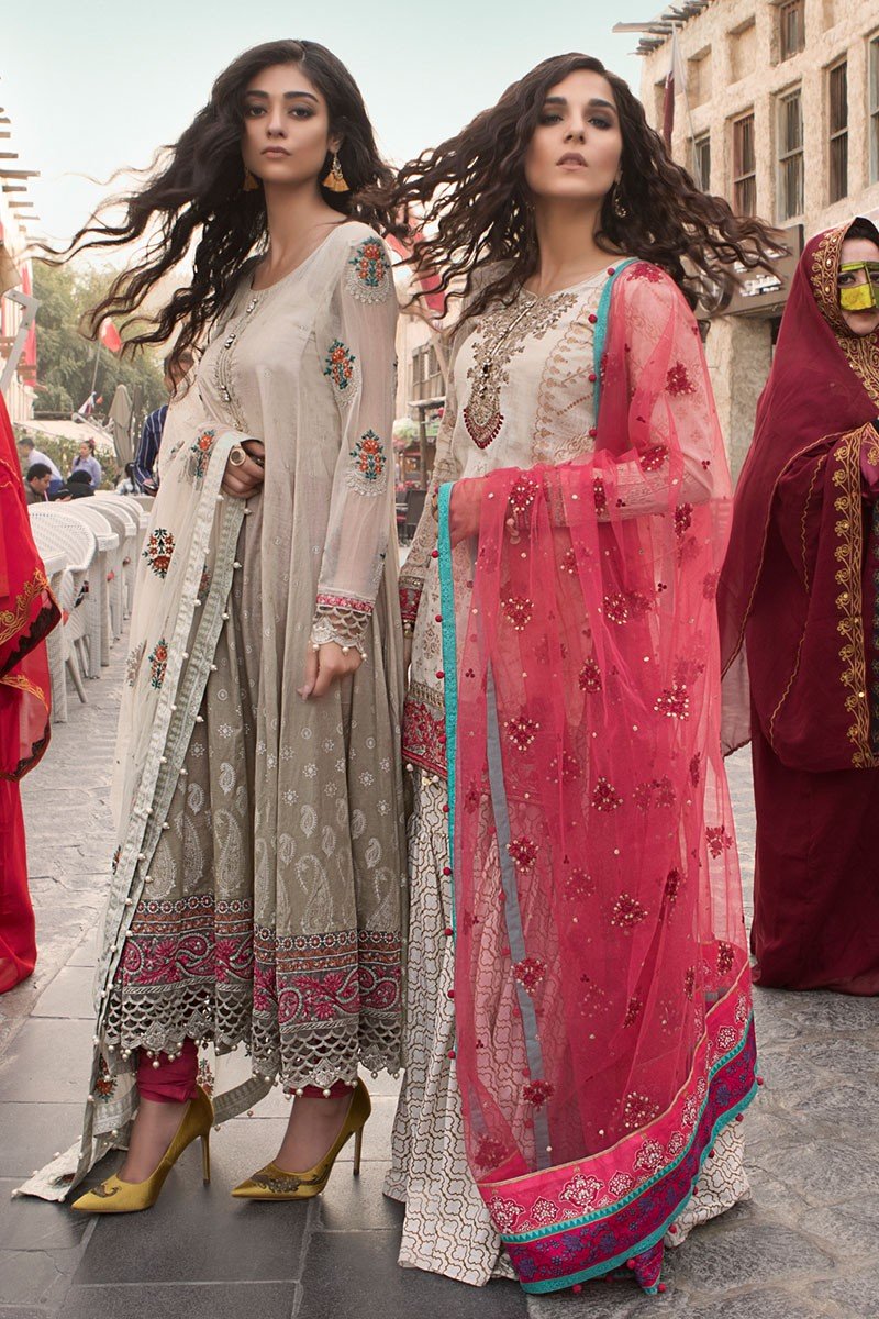 Fabric: Lawn Printed Front 1.5M Lawn Printed Back 1.5M Chiffon Embroidered Sleeves 0.67M Cambric Printed Trouser 2.5M Net Embroidered Dupatta 2.75M Lawn Dupatta Printed Patti 9M Neckline Patti 1Yard Ghera Patti 2M Ghera Patti Ii 2M Sleeve Patti 1 Yard Swarovski Buttons. |