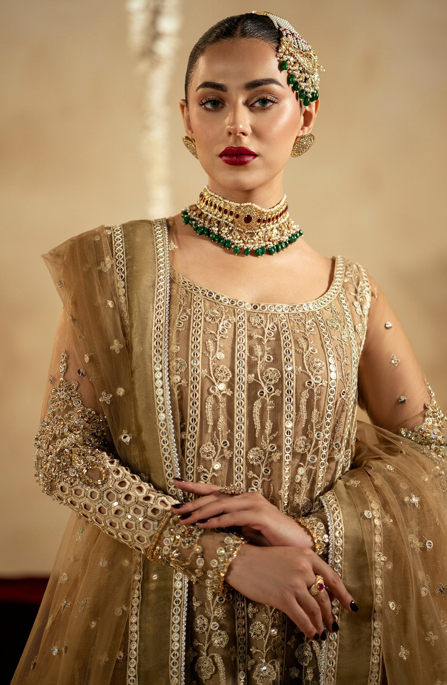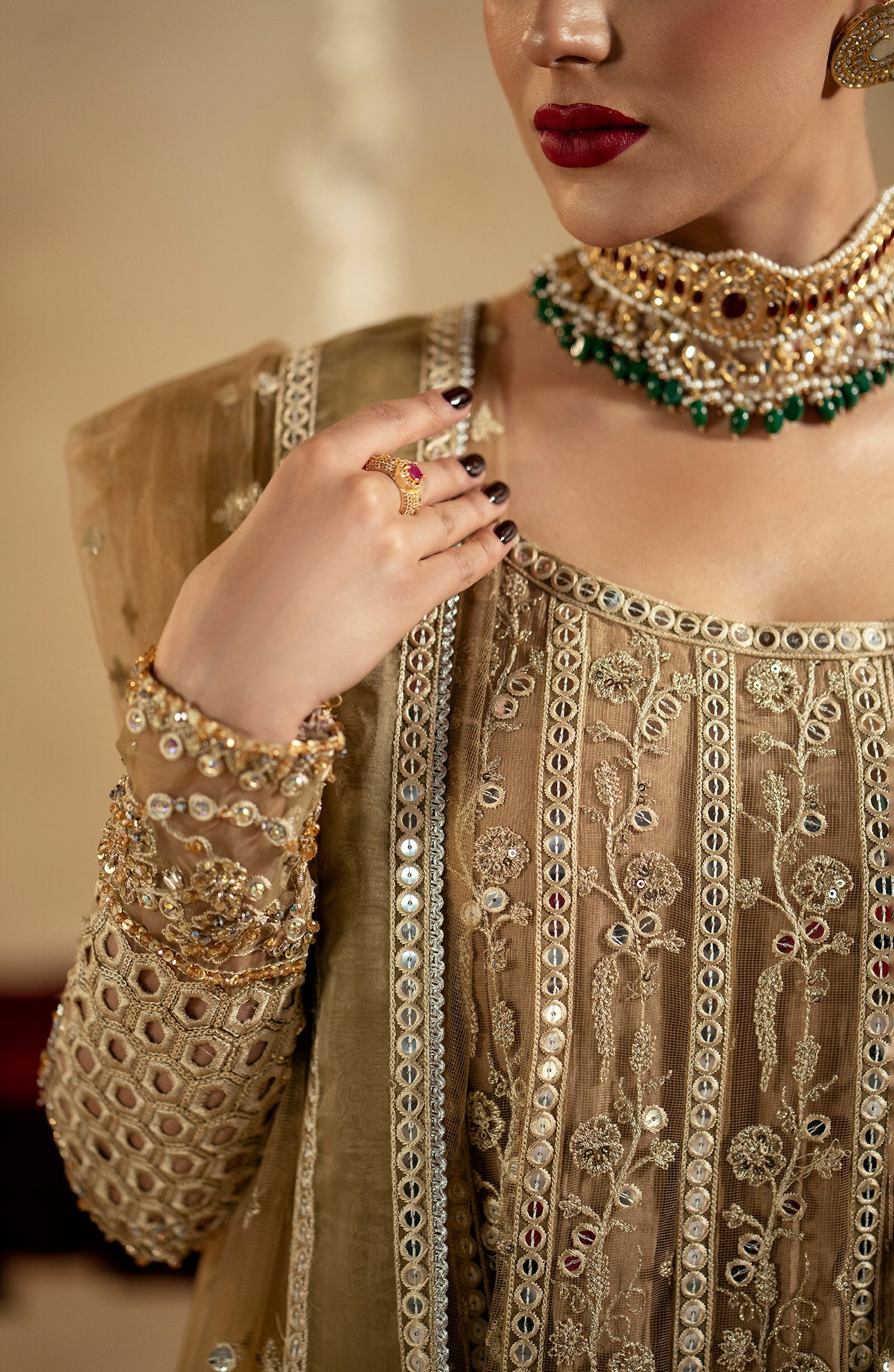 | Fabric: Details: Embroidered Front,Back Kali (Net) 18pc Fabric: Net Dupatta: Embroidered Dupatta (Net) with 4 Side Patti patch (Organza) 2.75Yrds Trouser: |