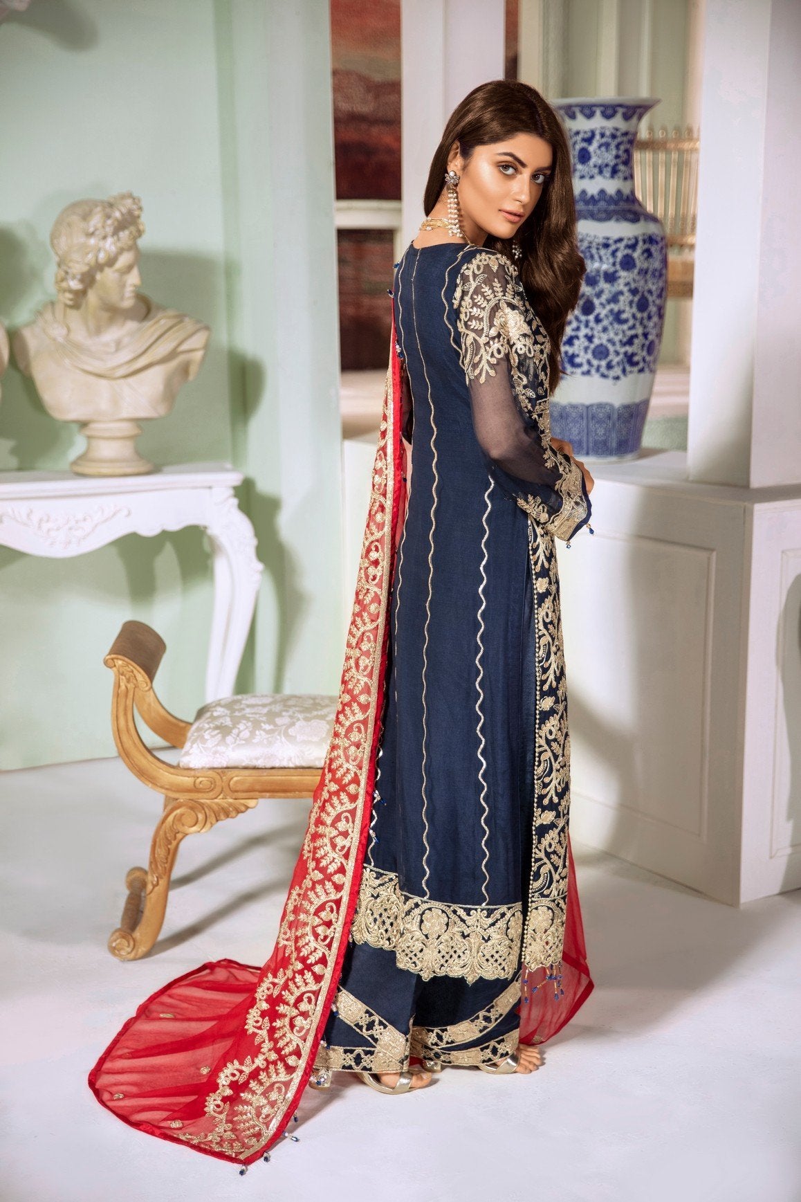 Fabric: EMBROIDERED CHIFFON FRONT BACK AND SLEEVES EMBROIDERED CHIFFON DUPATTA EMBROIDERED DAMAN PATCHES GRIP TROUSER AND ACCESSORIES. |