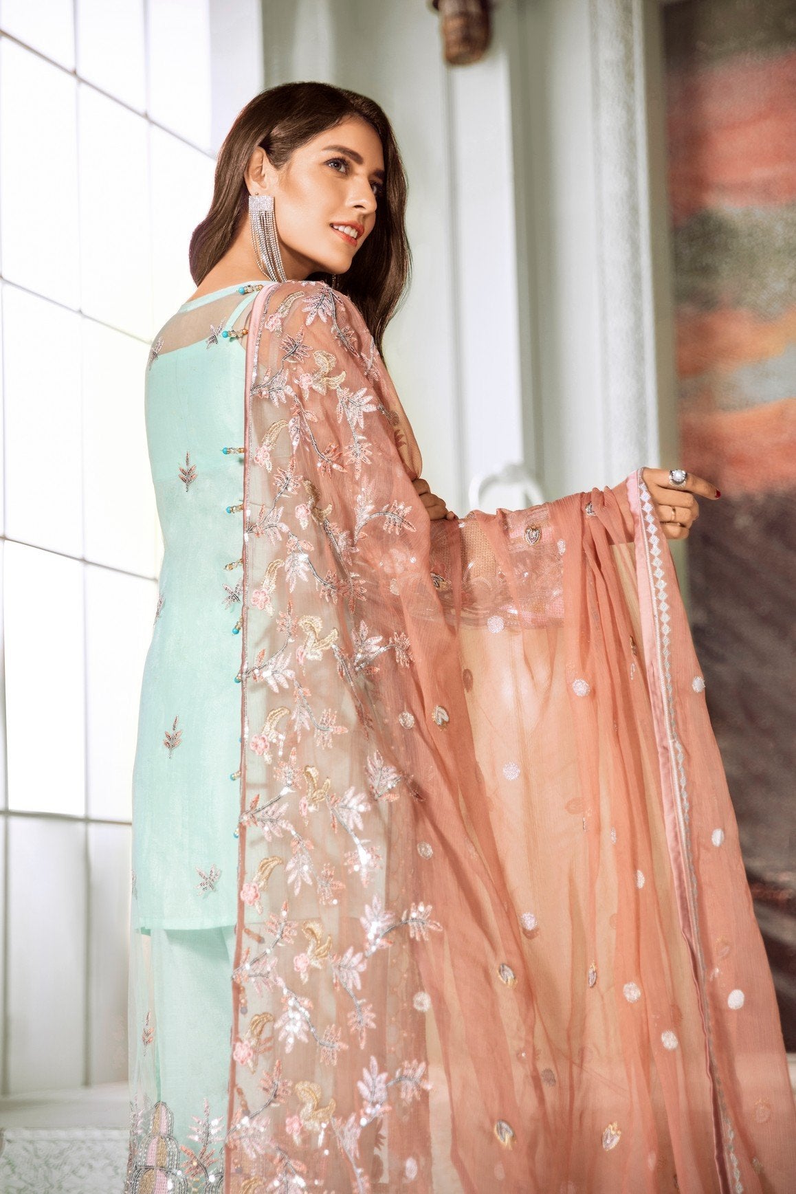 Fabric: EMBROIDERED NET HANDMADE FRONT AND SLEEVES EMBROIDERED CHIFFON DUPATTA EMBROIDERED HANDMADE DAMAN PATCHES GRIP TROUSER AND ACCESSORIES. |