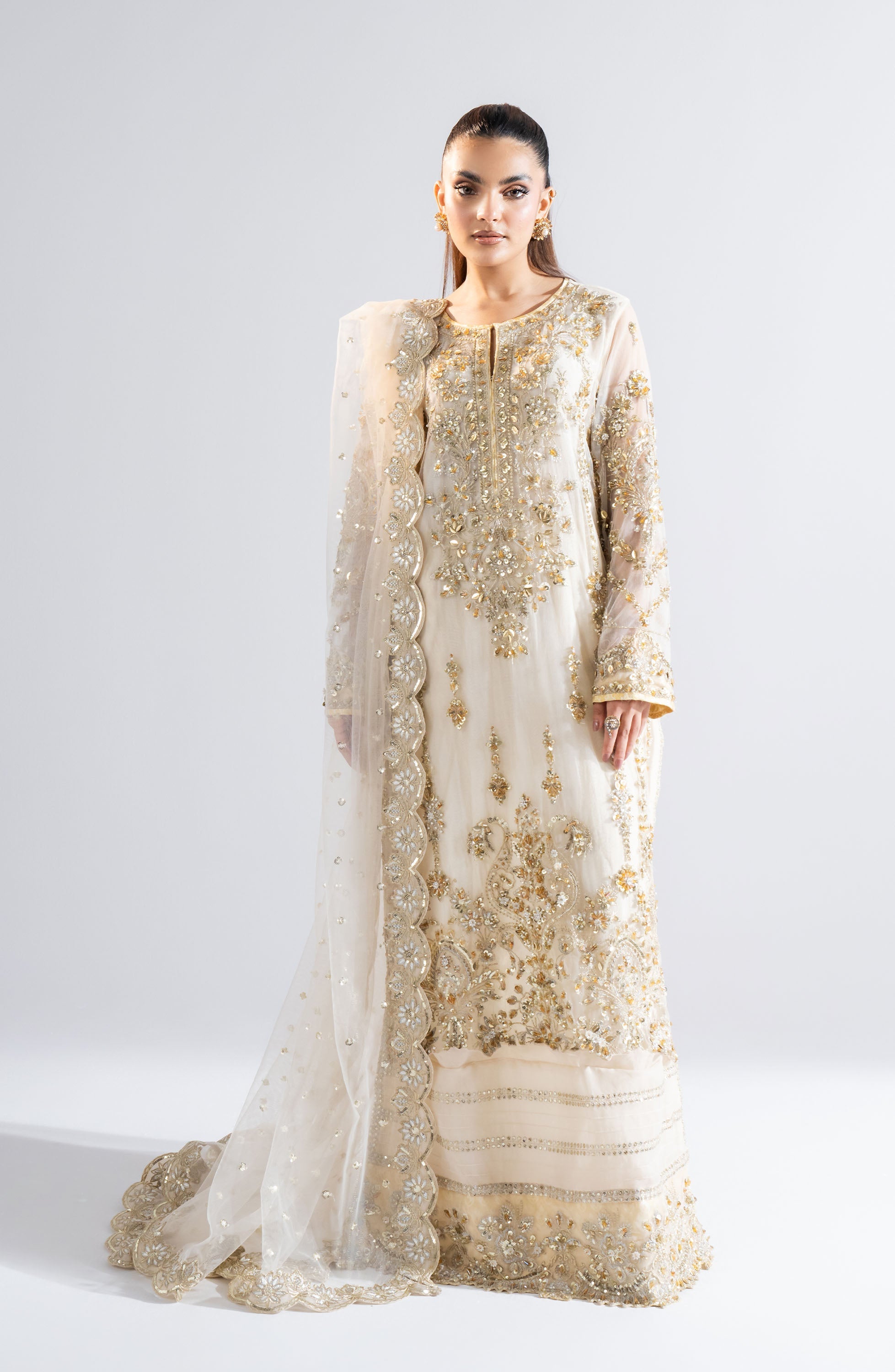 Fabric: Details Color: Irish Cream Shirt: Embroidered Handmade Front (Net) 1 Pc Dyed Back (Net) 1 Pc Embroidered Handmade Sleeves (Net) 1 Pair Embroidered Handmade Front Daman Patti (Organza) 0.85 Yrds Embroidered Back Daman Patti (Organza) 0.85 Yrds Embroidered Front Patti (Organza) 0.85 Yrds Embroidered Front,Back,Slit Patti (Organza) 3.80 Yrds Fabric: Net + Organza Dupatta: Embroidered Dupatta (Net) 2.75 Yrds Fabric: Net Trousers: Trouser (Jamawar) 2.85 Yrds Fabric: Jamawar Note: Product Color May Slightly Vary Due To Photographic Lighting Sources Or Your Device Settings. |