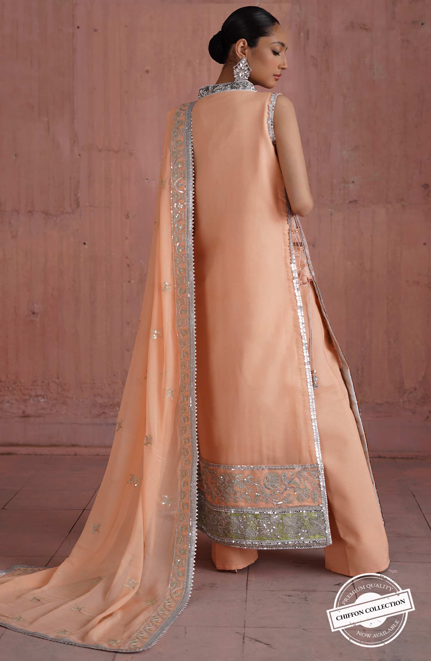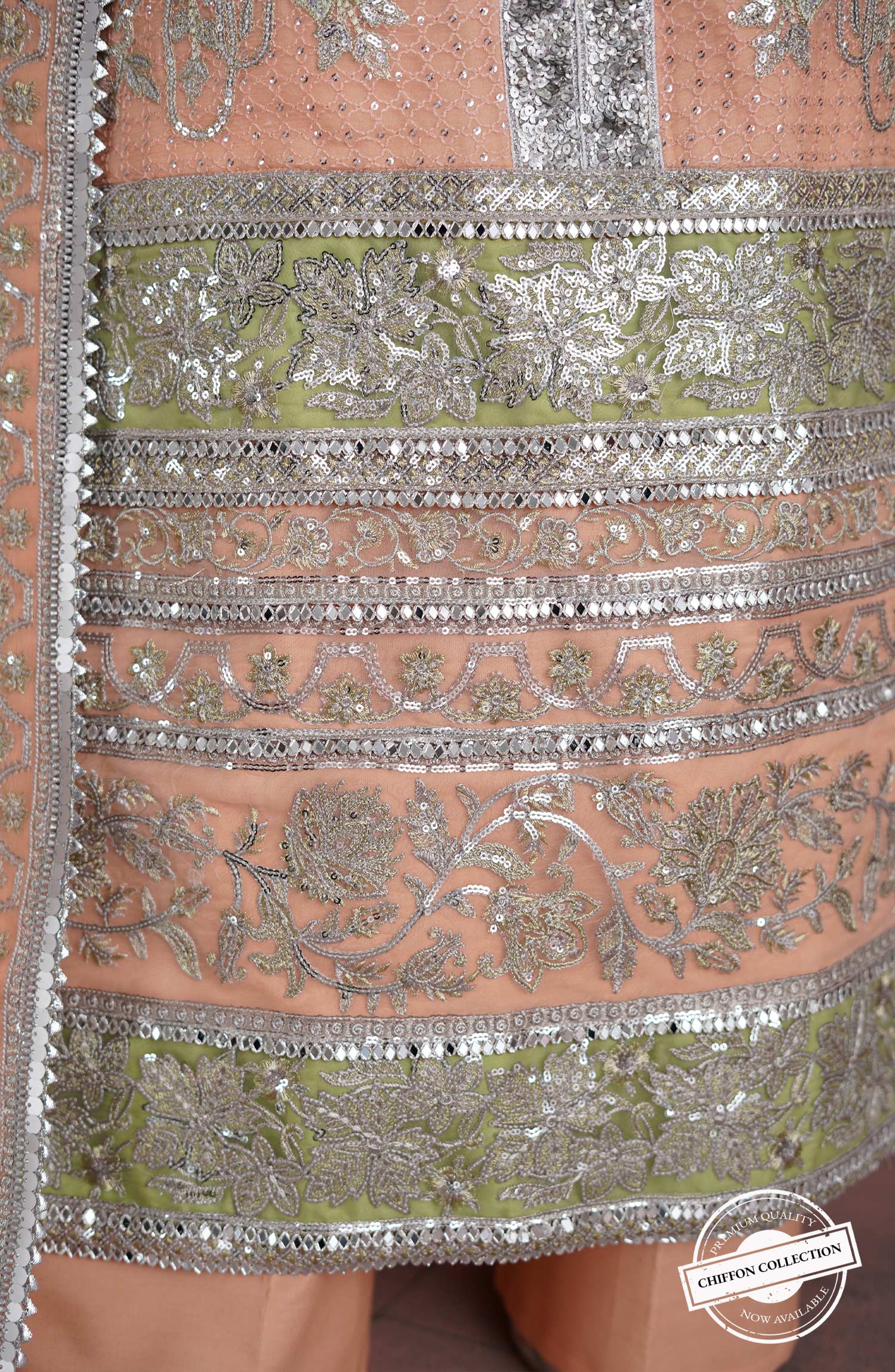 Fabric: Embroidered chiffon front left & right panel Chiffon back & sleeves Embroidered organza front & back daman Patti patches Center Patti Patch Embroidered chiffon dupatta Grip trouser |