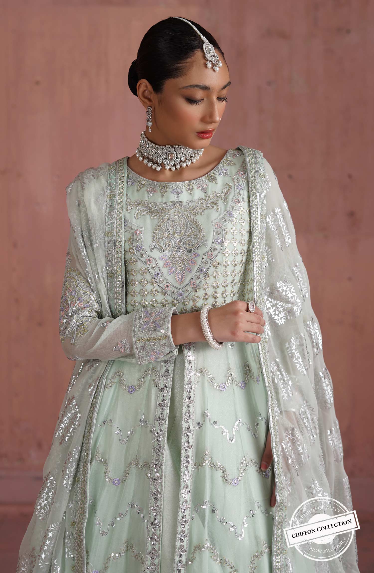 Fabric: Embroidered chiffon front kali back kali sleeves & bodice Embroidered organza front back Patti patch & front center Patti patch Foil print chiffon dupatta with embroidered organza Patti patch Jecuard lehenga |