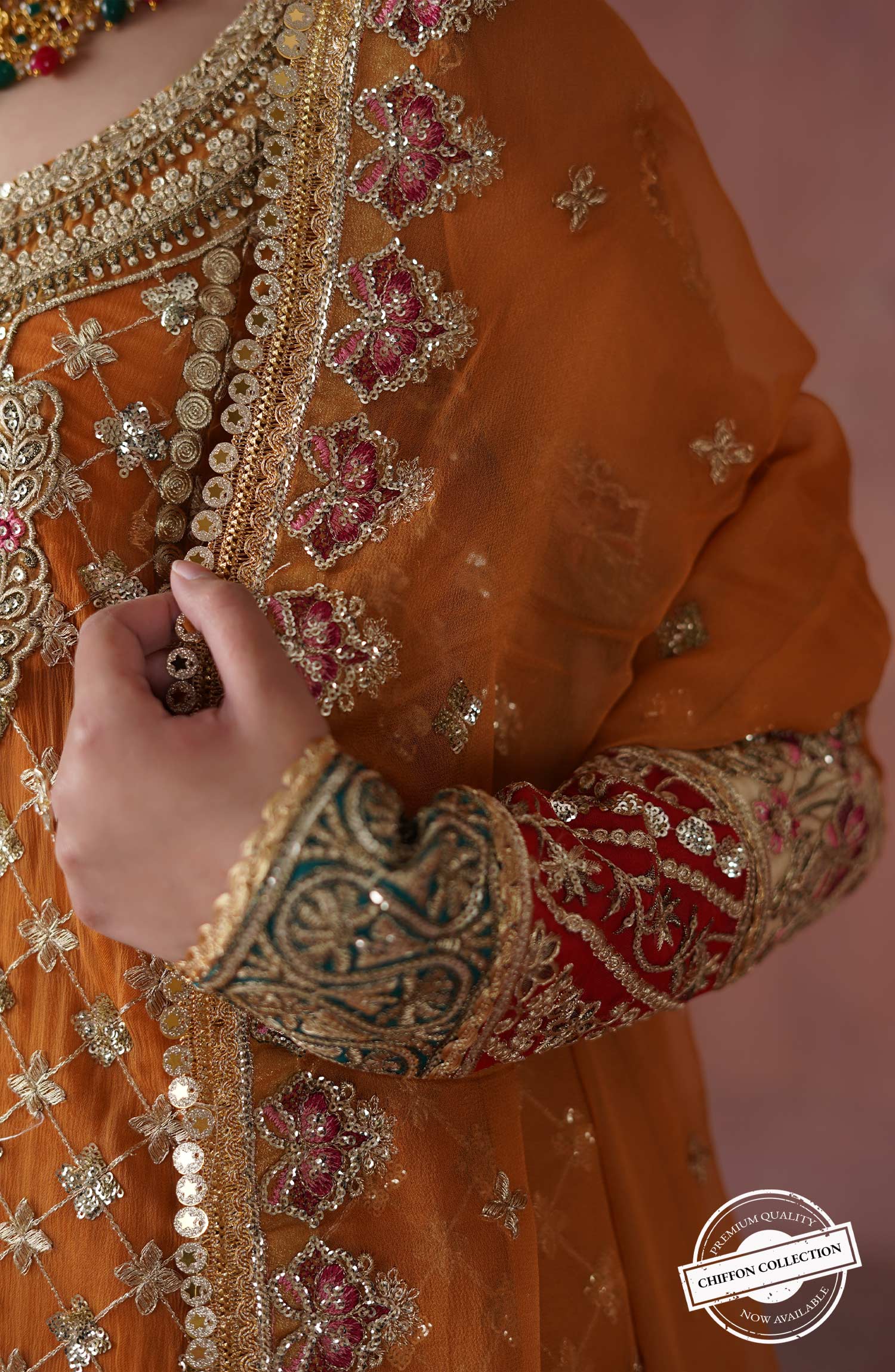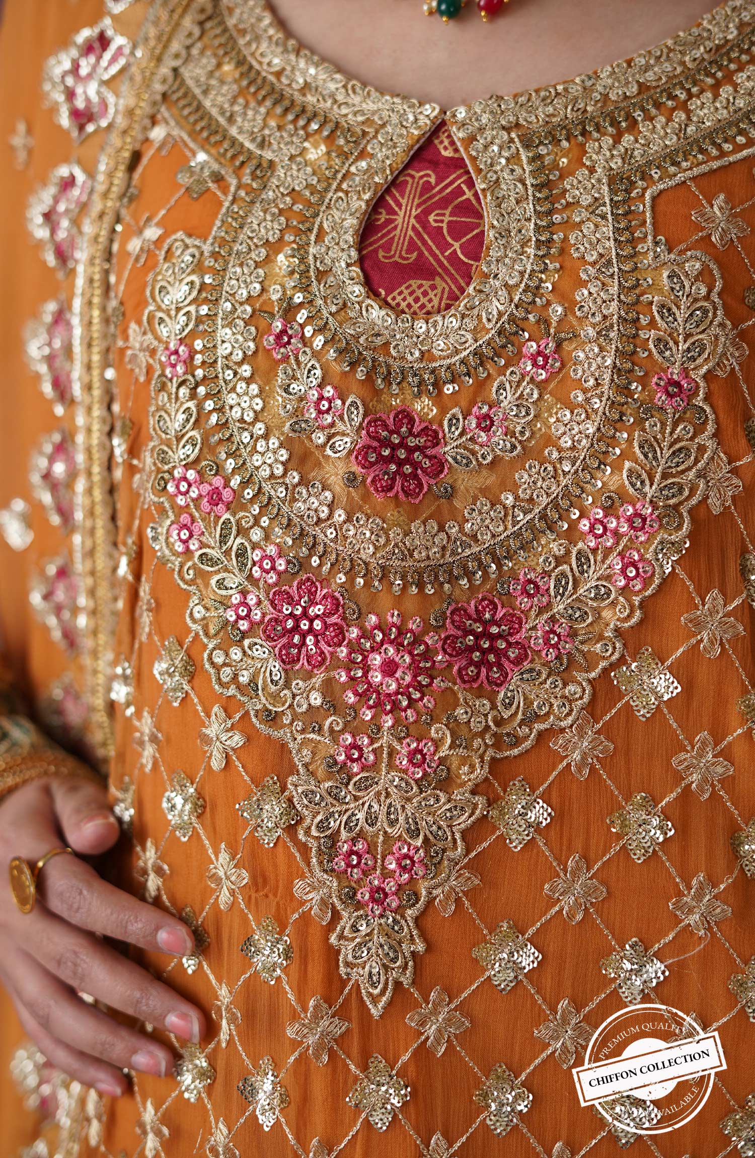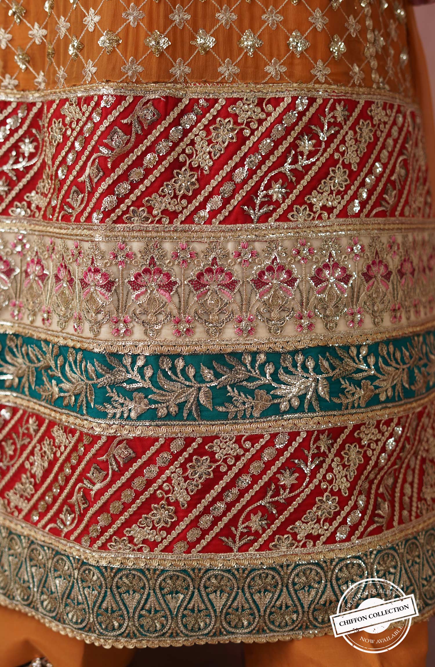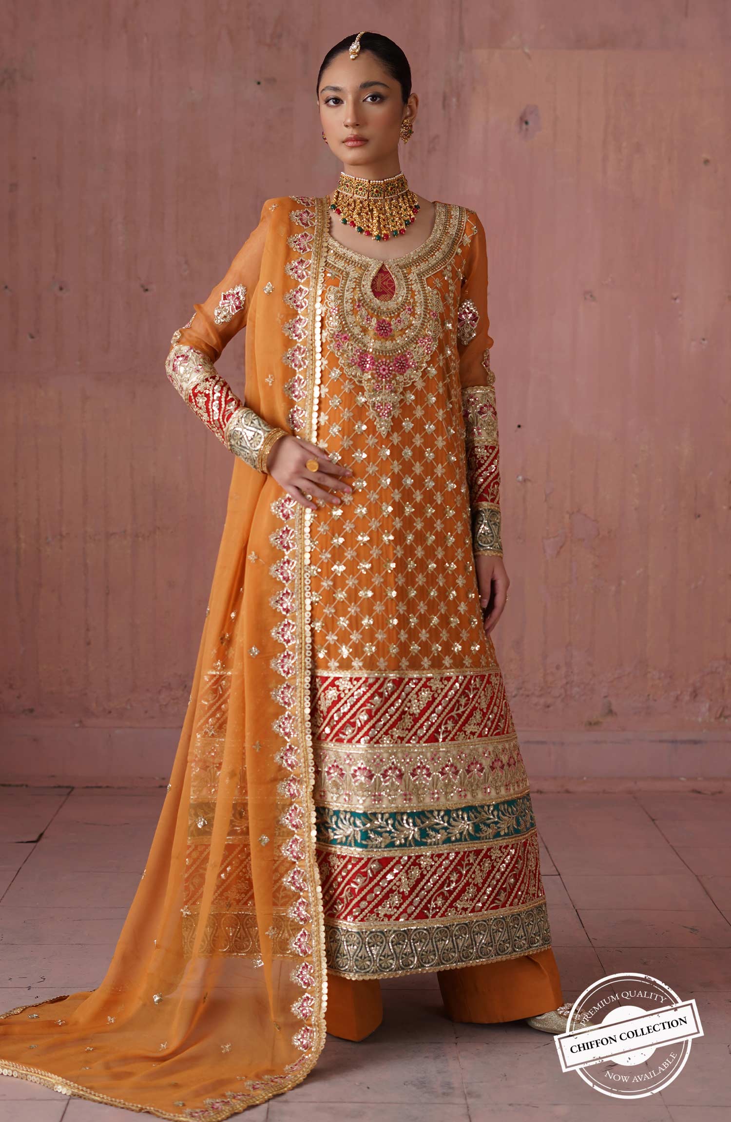 Fabric: Embroidered chiffon front & sleeves Chiffon back Embroidered organza front back & sleeves Patti patch Embroidered organza neck patch Embroidered chiffon dupatta Grip trouser |