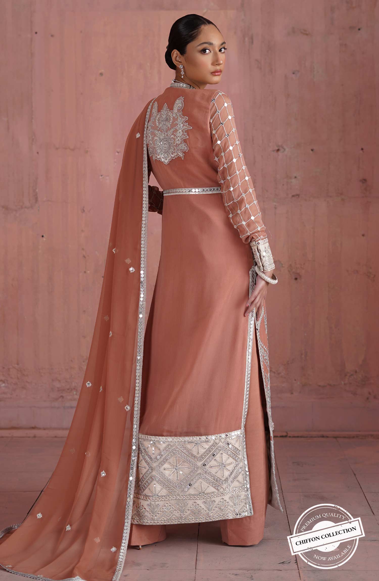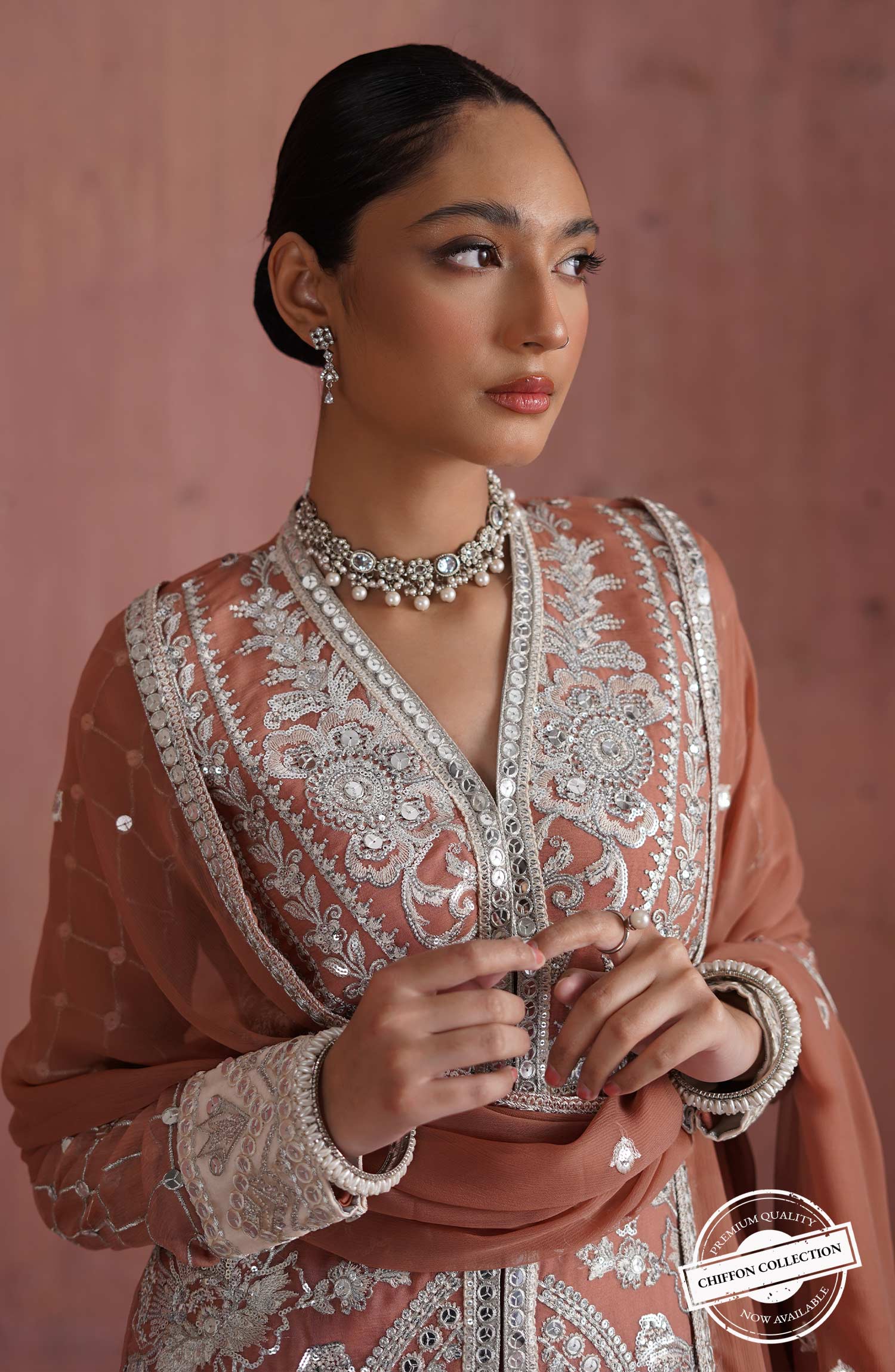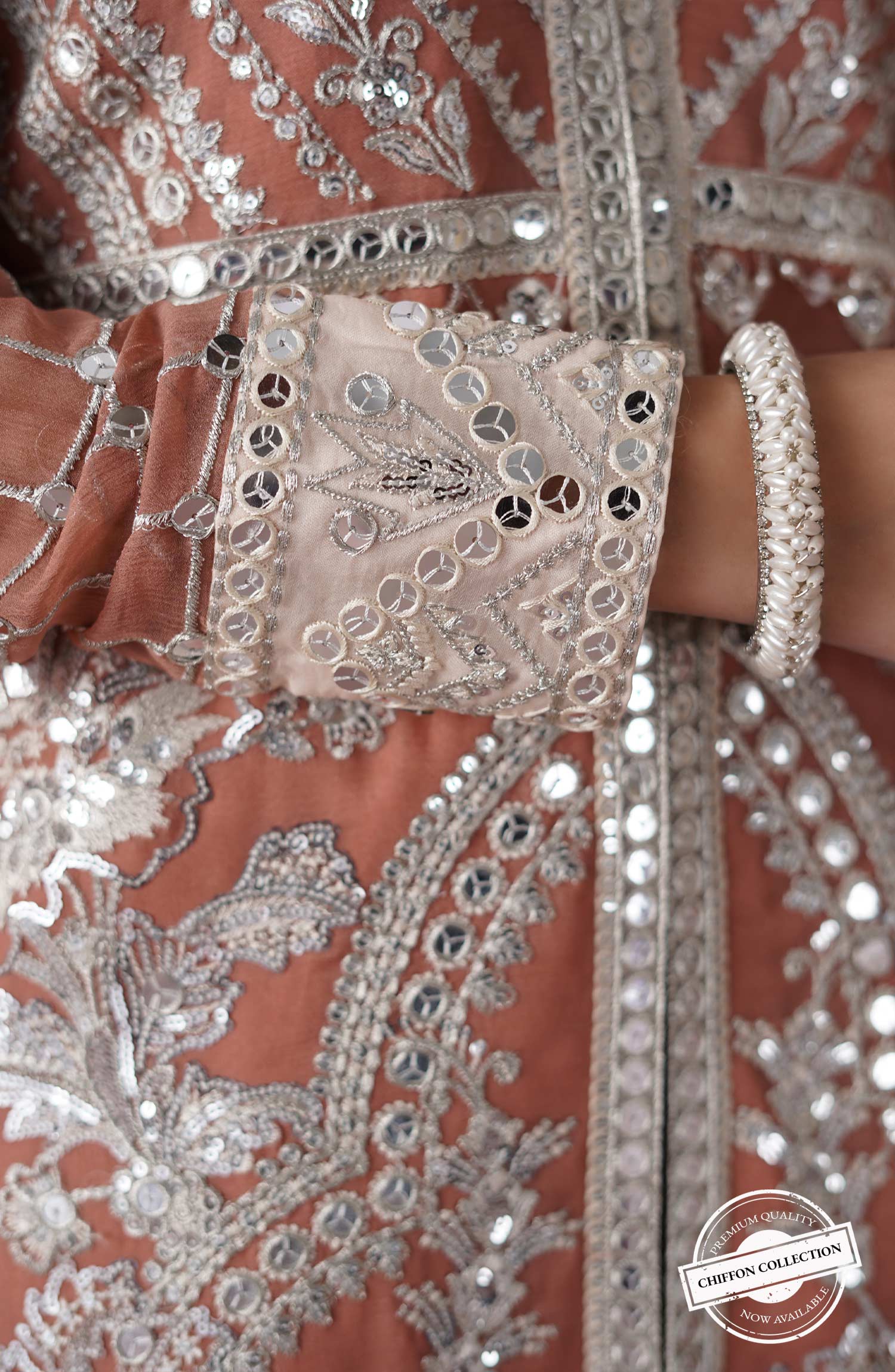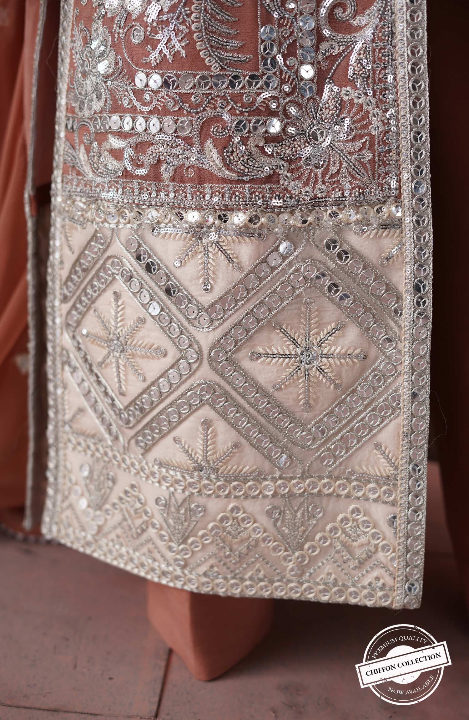 Fabric: Embroidered chiffon front left & right panel & sleeves Chiffon back with embroidered organza motif patch Embroidered organza front back daman & sleeves Patti & front center Patti patch Embroidered chiffon dupatta Grip trouser |