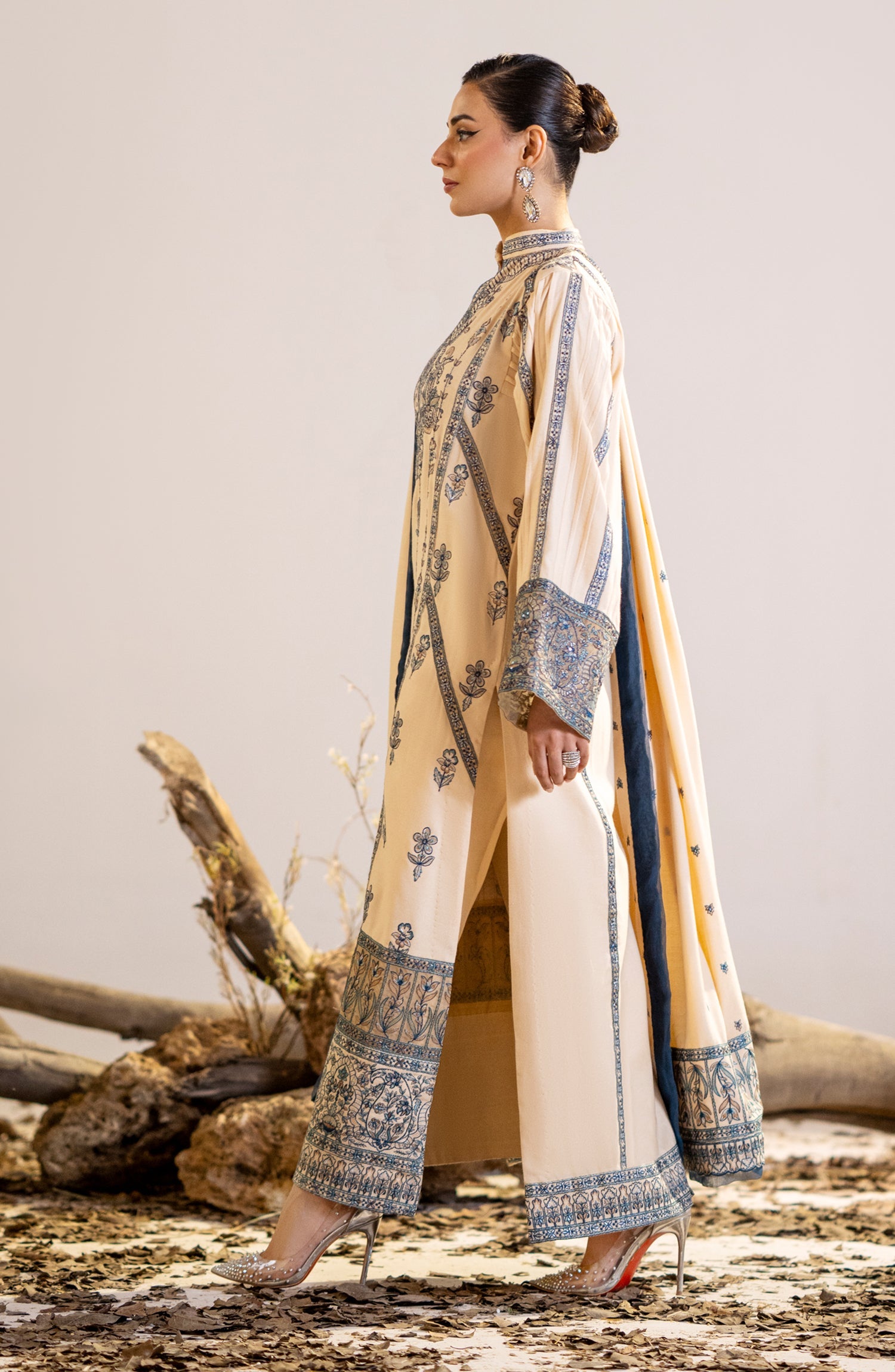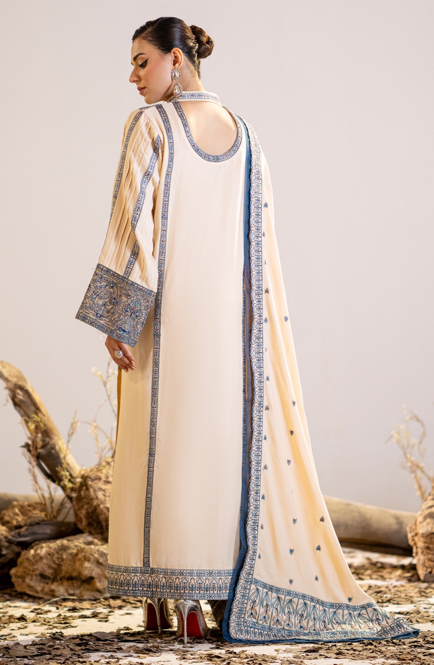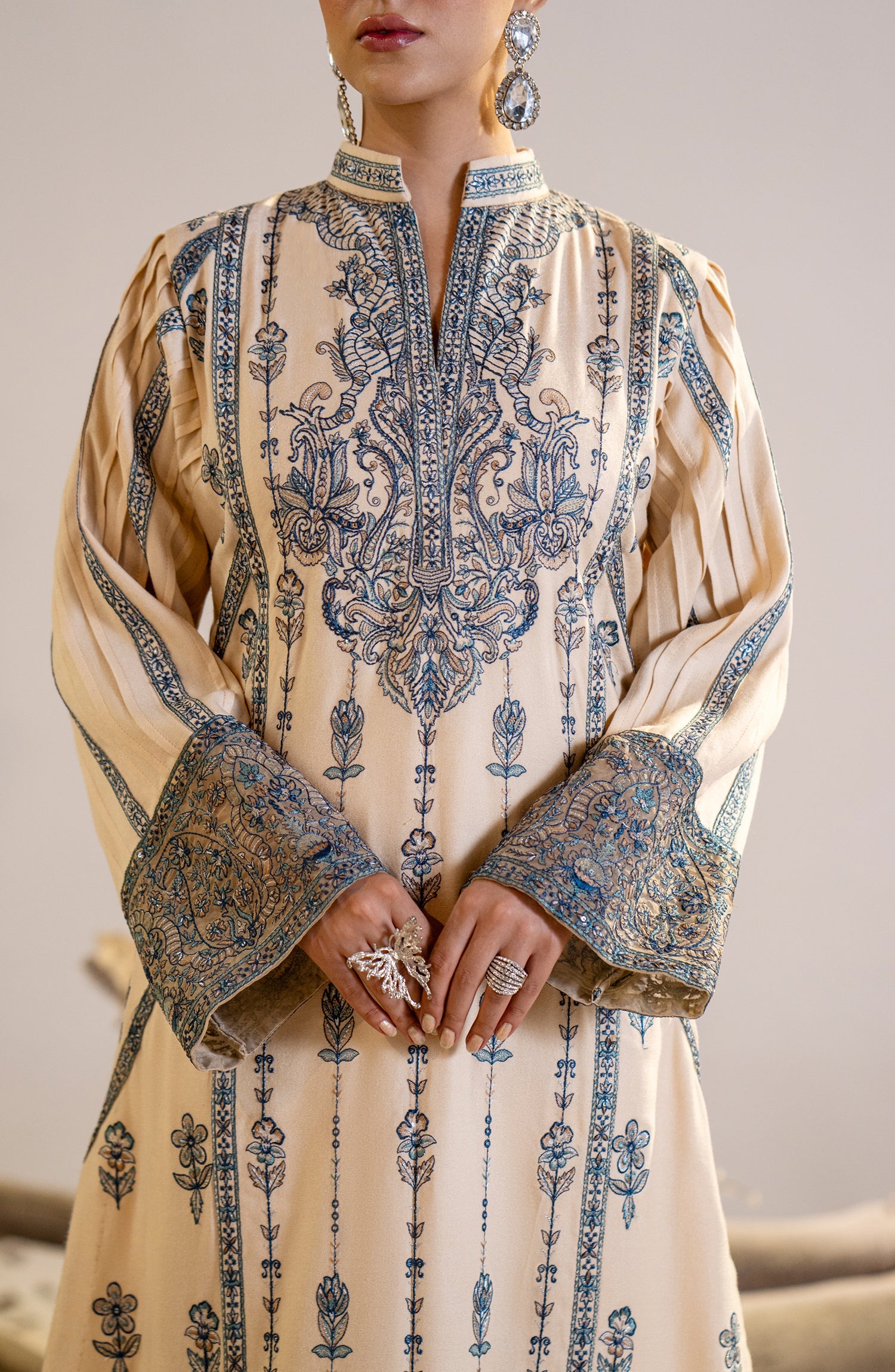 | Fabric: Embroidered Front Center Panel (Peach Leather) Embroidered Front Left Panel (Peach Leather) Embroidered Front Right Panel (Peach Leather) Dyed Back, Sleeves (Peach Leather) Embroidered Front Patti- 1 (Peach Leather) Embroidered Back Patti (Peach Leather) Embroidered Front Patti- 2 (Organza) Embroidered Sleeves Patti (Organza) Embroidered Neck, Back, Sleeves, Trouser Patti Patch (Organza) Fabric: Peach Leather Dupatta: Embroidered Dupatta (Peach Leather) Embroidered Dupatta Pallu (Peach Leather) Trousers: Dyed Trouser (Peach Leather) |