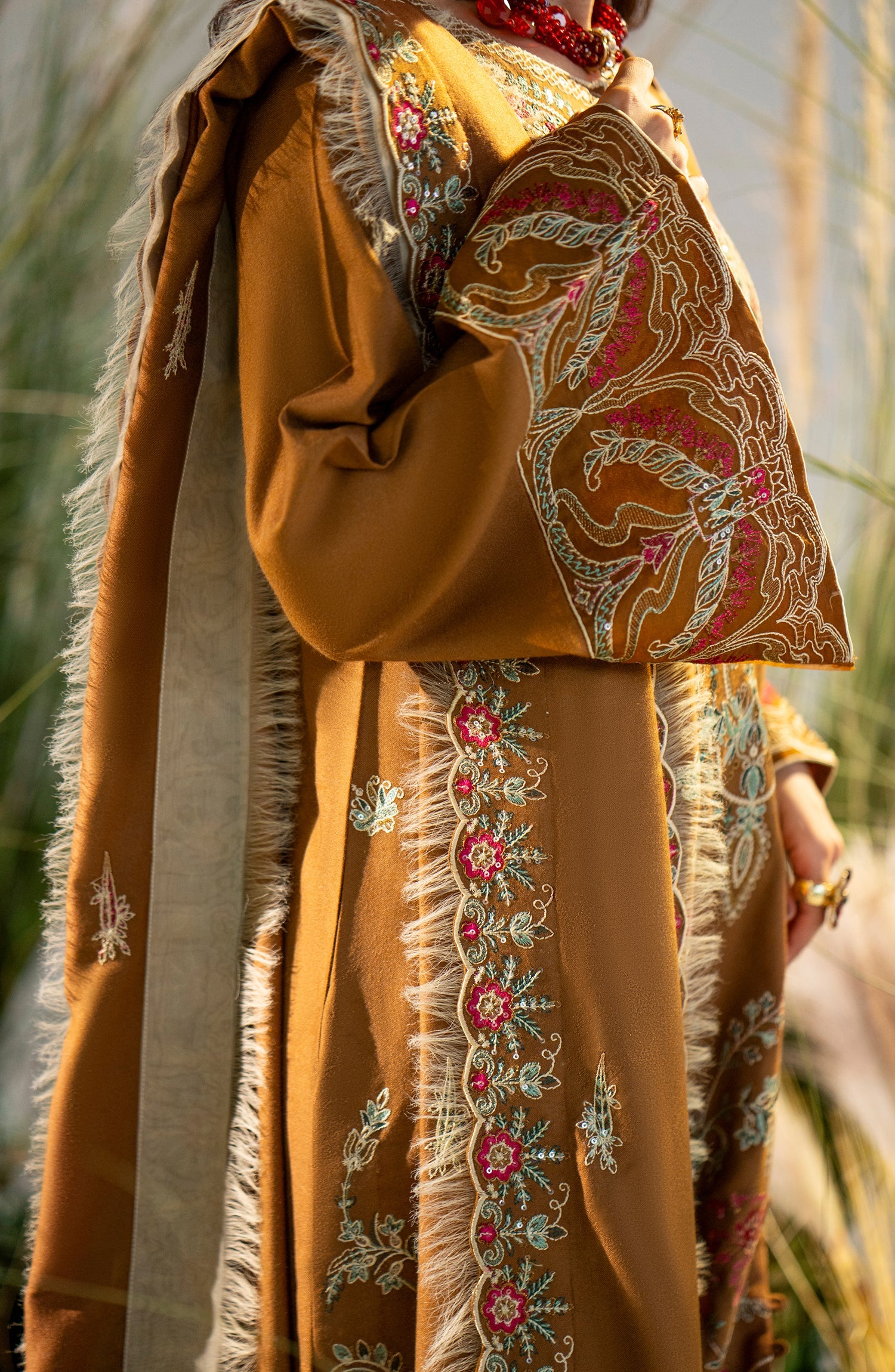 | Fabric: Embroidered Front Center Panel (Peach Leather) Embroidered Front Left Panel (Peach Leather) Embroidered Front Right Panel (Peach Leather) Dyed Back,Sleeves (Peach Leather) Embroidered Front, Back,Sleeves Patti (Peach Leather) Embroidered Back Neck (Peach Leather) Fabric: Peach Leather Dupatta: Embroidered Dupatta (Peach Leather) Trousers: Dyed Trouser (Peach Leather) |
