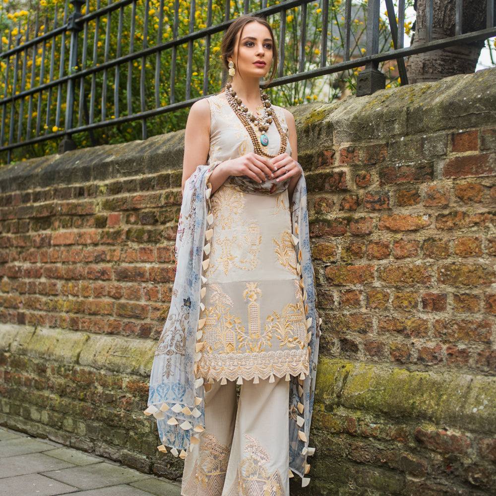 Fabric: Shirt Front 1.5 Mtr Emb Digital Back + Sleeves 1.75 Mtr Digital Dupatta 2.5 Mtr Trouser 2.5 Mtr Sleeves Bunch 2 Pcs Daman Lace 60 Inch Trouser Bunch 2 Pcs Shirt Front Bunch 2 Pcs |