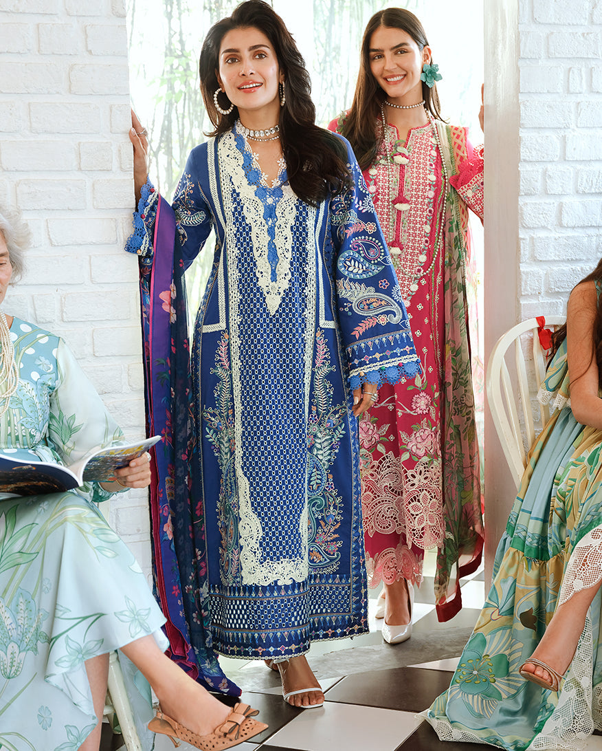 Summary: Radiate elegance in this stunning Blue Pakistani Lawn Suit from Mushq's Amoi Luxury Lawn collection, beautifully showcased by Ayeza Khan. The shirt boasts intricate Chikan embroidery on the front and sleeves, enhanced by refined silk borders and delicate crochet lace details that elevate the look. Paired with a vibrant digital print chiffon dupatta, this ensemble offers the perfect blend of traditional artistry and modern style. Ideal for summer festivities, Eid, or daytime events, the breathable lawn fabric ensures cool comfort without compromising on glamour. This unstitched dress material allows for custom styling to suit your unique taste. Shop this exquisite Pakistani dress online and embrace sophisticated party wear.