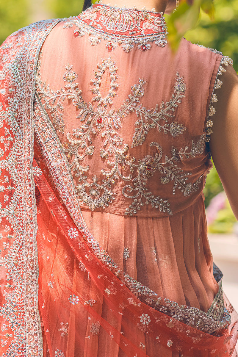 Fabric: Hand embellished front yoke on chiffon Hand embellished back yoke on chiffon Hand embellished neckline band on silk Embroidered and sequinned chiffon for front and back Embroidered and sequinned chiffon for sleeves Embroidered and sequinned net dupatta Cotton silk under shirt Raw silk trouser Pearls for finishing |