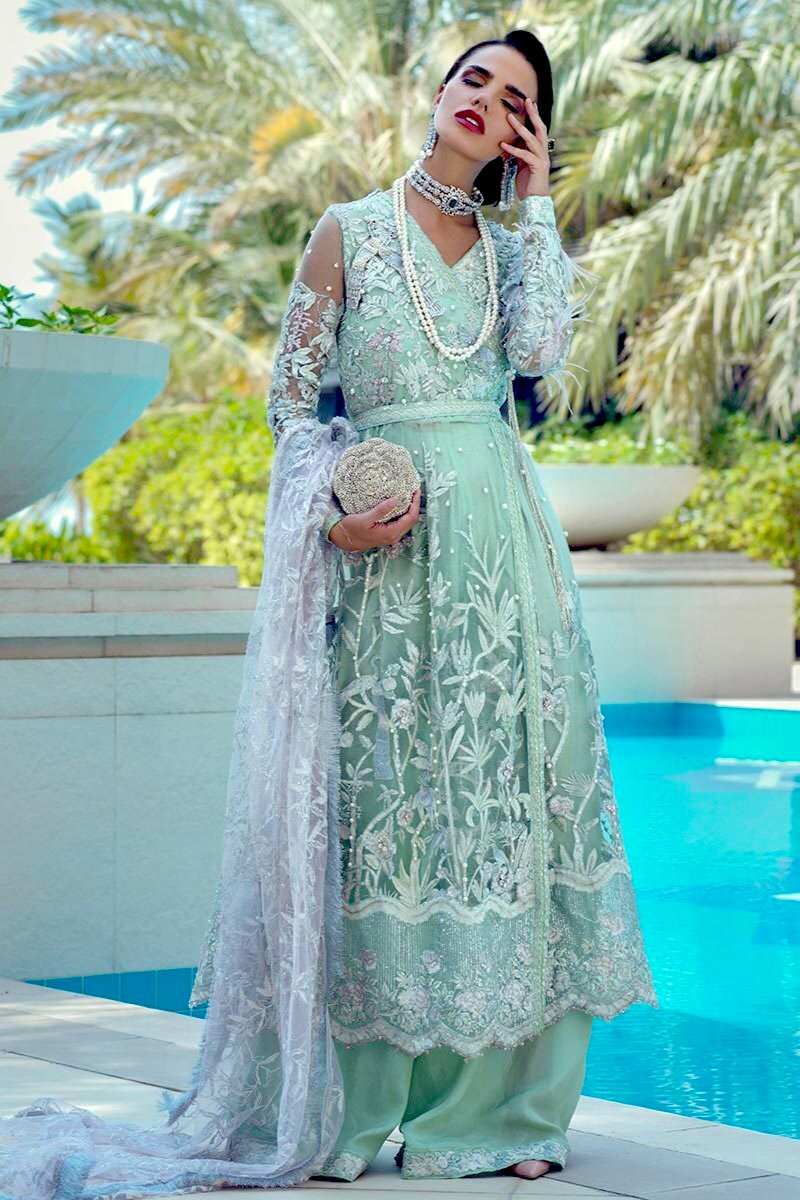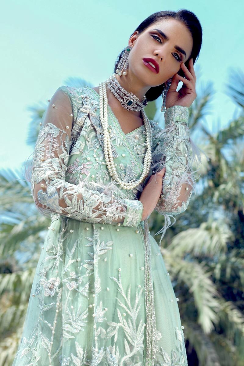 Fabric: Embroidered, sequinned and embellished front yoke on net Embroidered and sequinned back yoke and sleeves on net (1m) Embroidered, sequined and embellished net for front (1.25m) Embroidered and sequinned net for back (1.3m) Embroidered and sequinned hem border on organza (2m) Embroidered, sequinned and embellished finishing lace for shirt (2m) Embroidered and sequined lace for neckline |