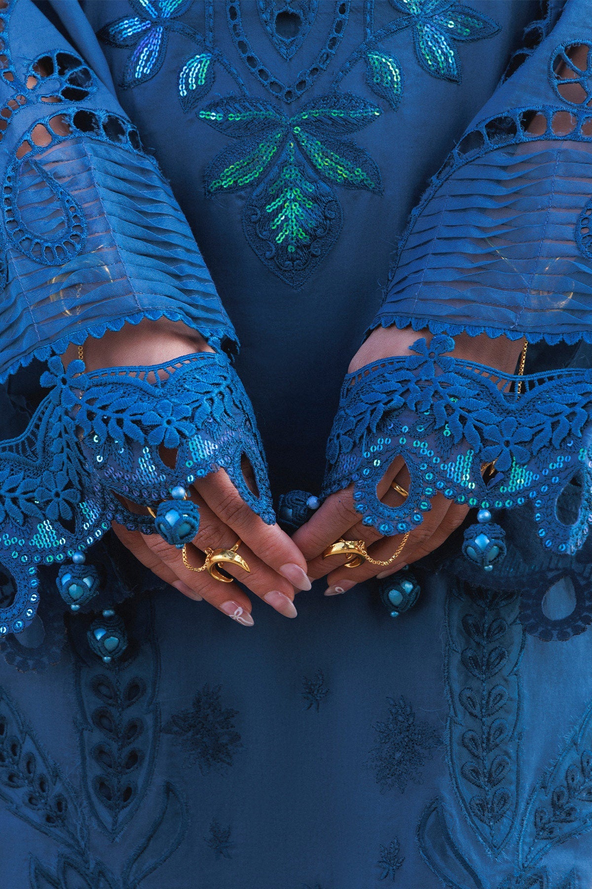 Summary: Embrace sophisticated elegance with the Nureh Aman Luxury Lawn – Kaia NE-229. This exquisite Pakistani suit features a kameez in a deep, captivating teal hue. Crafted from premium lawn fabric, this summer outfit is both breathable and luxurious, making it perfect for warmer seasons. The shirt is adorned with intricate embroidery and delicate laser-cut detailing, showcasing superior craftsmanship. Paired with an embroidered chiffon dupatta, this ensemble exudes grace. As a standout piece of festive clothing, this formal wear is an ideal choice for Eid celebrations, weddings, or any upscale gathering.