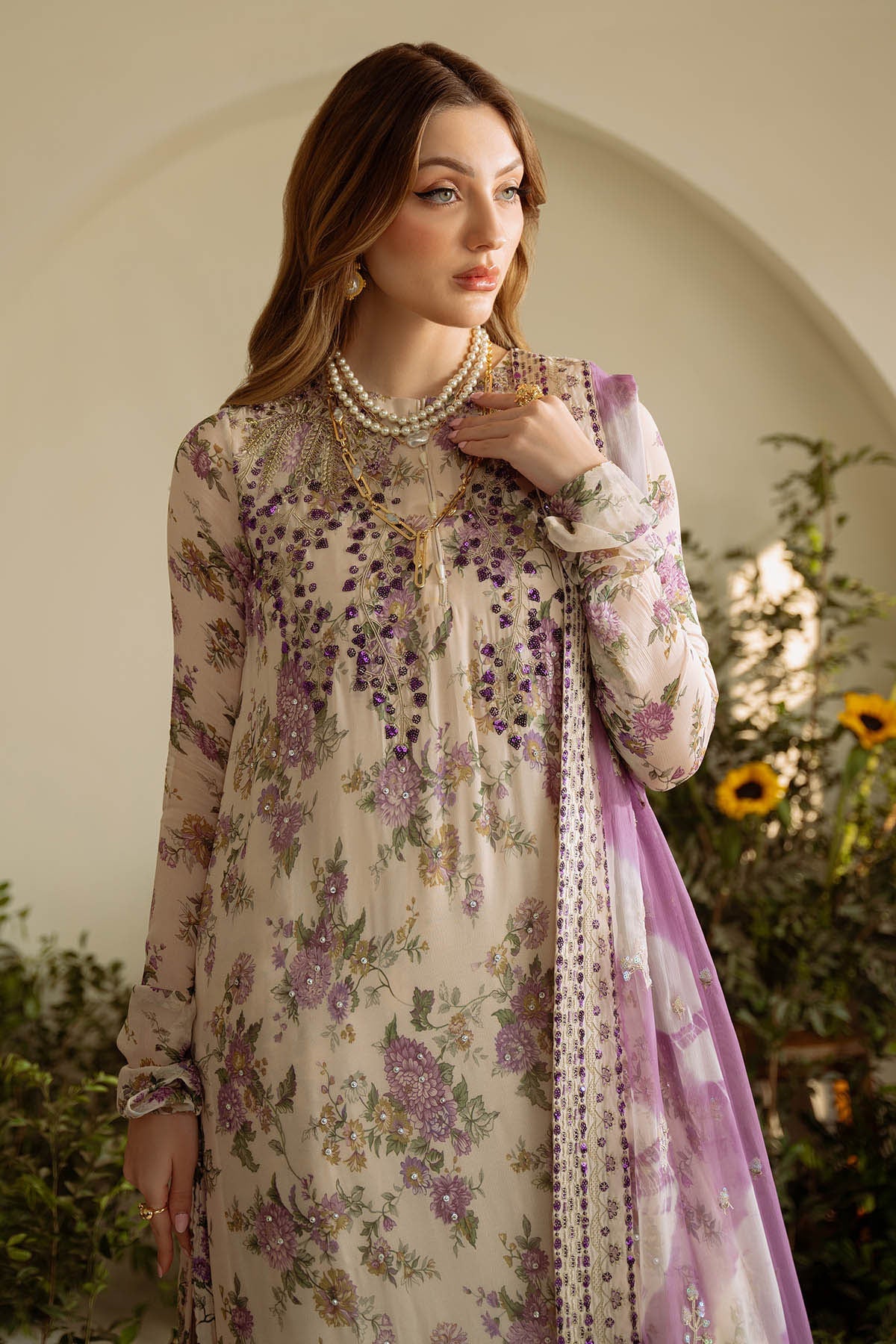 Fabric: Embroidered And Printed Chiffon Front With Stonework Printed Chiffon Back Embroidered Organza Front & Back Daman Border Printed Chiffon Sleeves Embroidered Chiffon Dupatta Embroidered Silk Dupatta 4 Sides Border Embroidered And Printed Trouser Plain Dyed Inner |