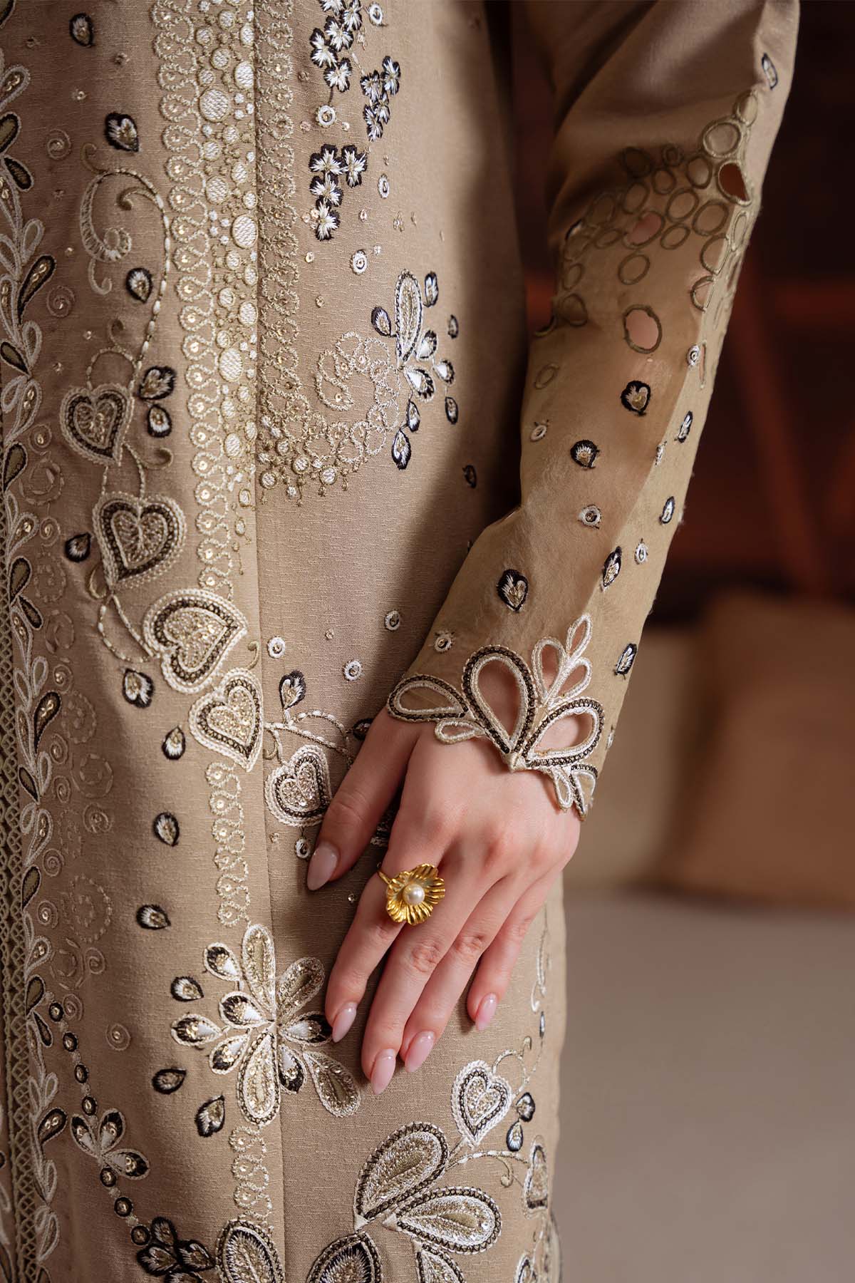 Summary: Discover sophistication with this stunning Beige Pakistani suit from Nureh's Fall/Winter collection. The kameez is masterfully crafted from premium Karandi, a fabric celebrated for its warmth and elegant drape, making it ideal for winter festivities. It features intricate and contrasting embroidery that cascades down the front panel, neckline, and sleeves, creating a look of understated luxury. This formal wear masterpiece is a perfect choice for weddings, dinner parties, and festive celebrations. Elevate your ethnic wardrobe with this timeless Karandi dress, designed for elegance and grace.