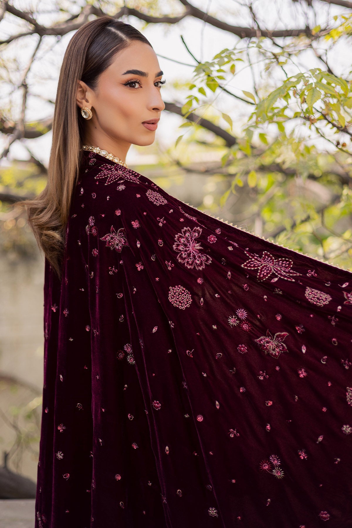 Summary: Embrace winter elegance with this stunning maroon Pakistani suit from the Nureh Maya Velvet Winter Edit. Crafted from luxurious, plush velvet, this outfit is designed for warmth and style during the colder months. The kameez features intricate tonal embroidery around the neckline and on the flared sleeves, creating a sophisticated focal point. This deep maroon shade is perfect for formal wear, making it an ideal choice for winter weddings and evening parties. As a premium unstitched ethnic wear piece, it offers a blend of traditional craftsmanship and contemporary grace, perfect for your next festive event.