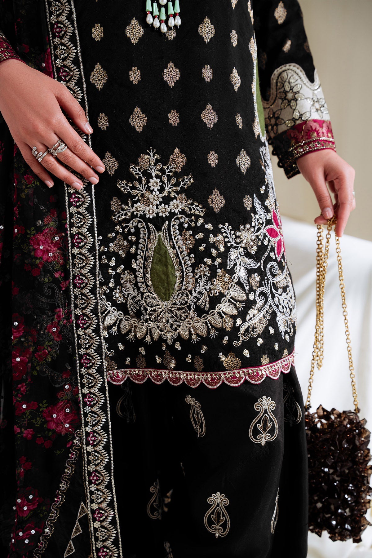 Fabric: EMBROIDERED JACQUARD APPLIQUE FRONT DYED JACQUARD BACK DYED JACQUARD SLEEVES EMBROIDERED ORGANZA NECK PATCH EMBROIDERED SILK 3 SIDES PATTI EMBROIDERED SILK SLEEVES MOTIFS EMBROIDERED SILK SLEEVES BORDER 1 EMBROIDERED SILK SLEEVES BORDER 2 EMBROIDERED AND PRINTED CHIFFON STONEWORK DUPATTA WITH EMBROIDERED CORNER PATCHES AND 4 SIDES BORDER EMBROIDERED RAWSILK TROUSER EMBROIDERED RAWSILK TROUSER PATCH DYED INNER |