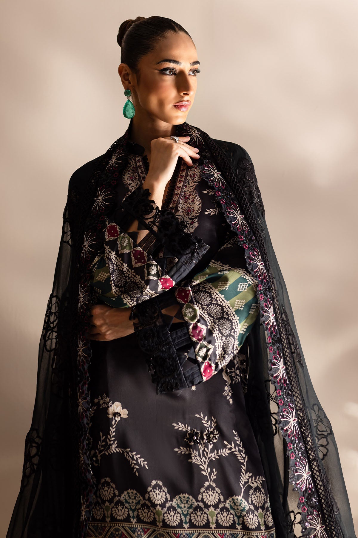 Fabric: EMBROIDERED, EMBELLISHED AND PRINTED SILK SHIRT, EMBROIDERED LASER CUT CHIFFON DUPPATTA AND PRINTED SILK TROUSER |