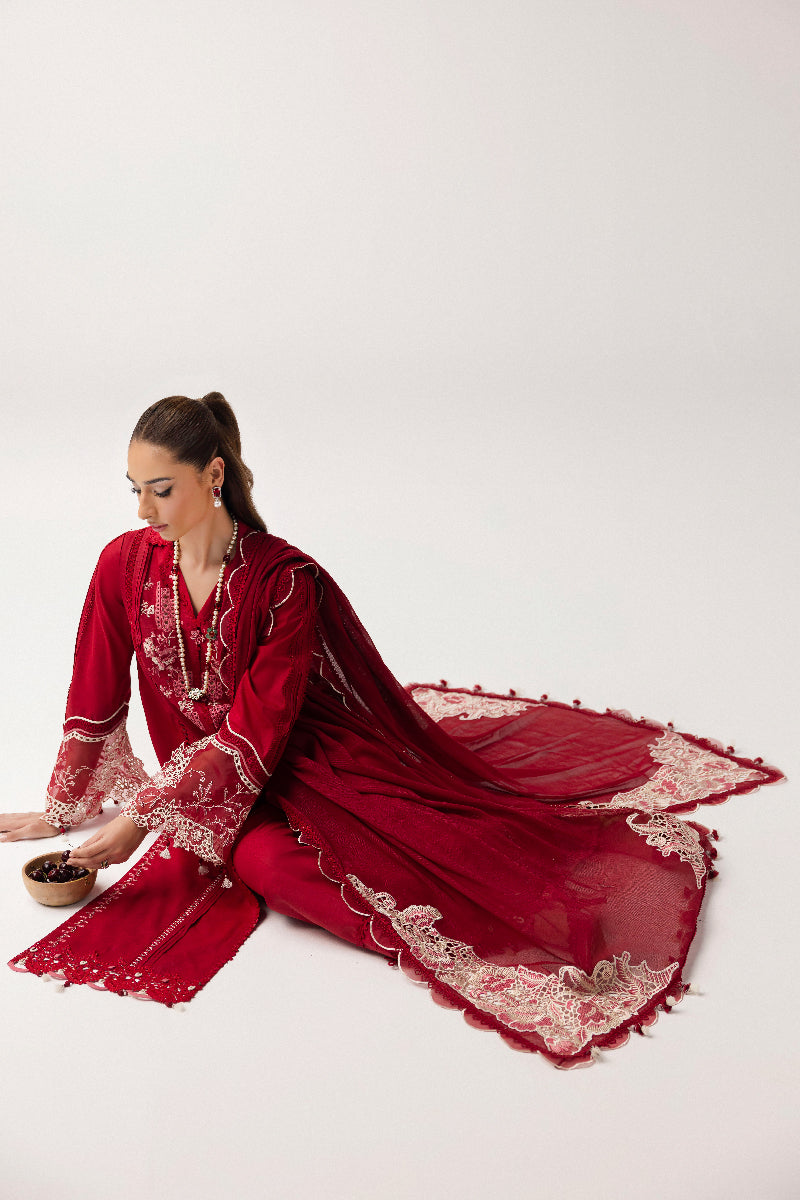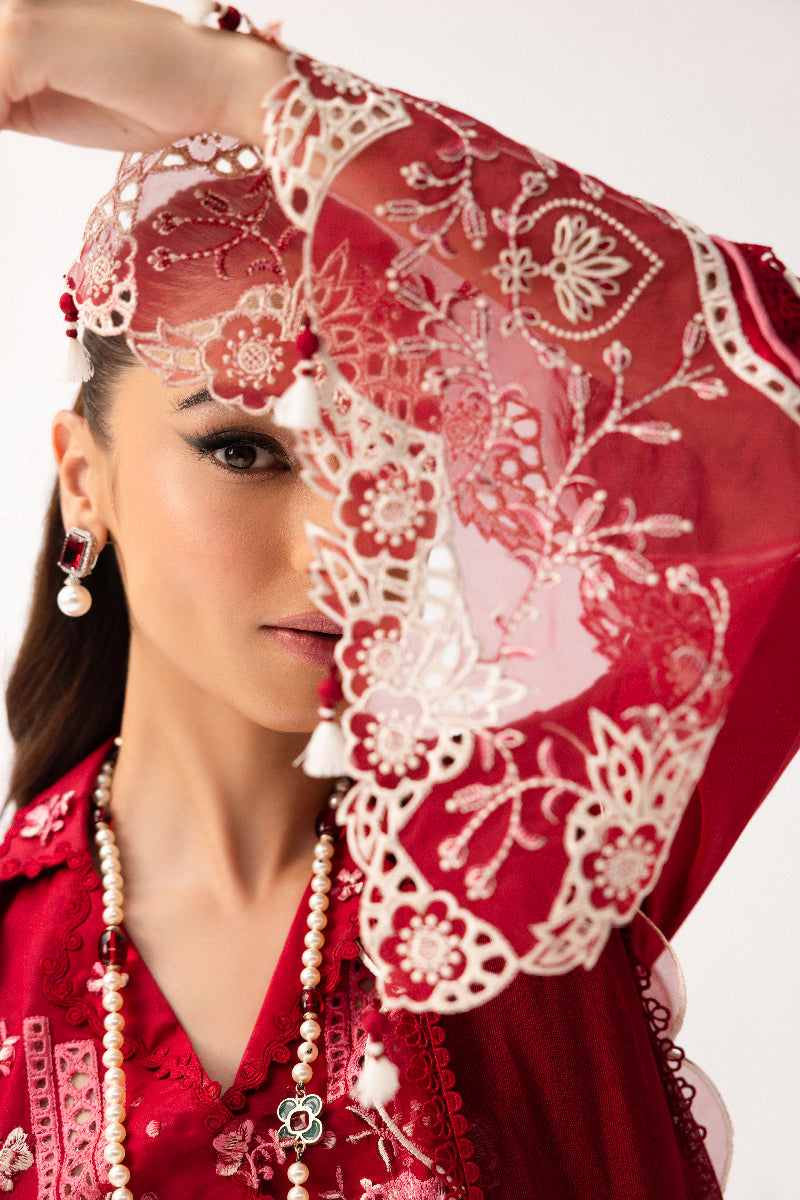 Fabric: Introducing a vibrant fresh red ensemble, beautifully adorned with white embroidery and lace details. Paired with a soft cotton net dupatta and plain trousers. Fabric Details Shirt: Lawn Dupatta: Cotton Net Trouser: Cotton |