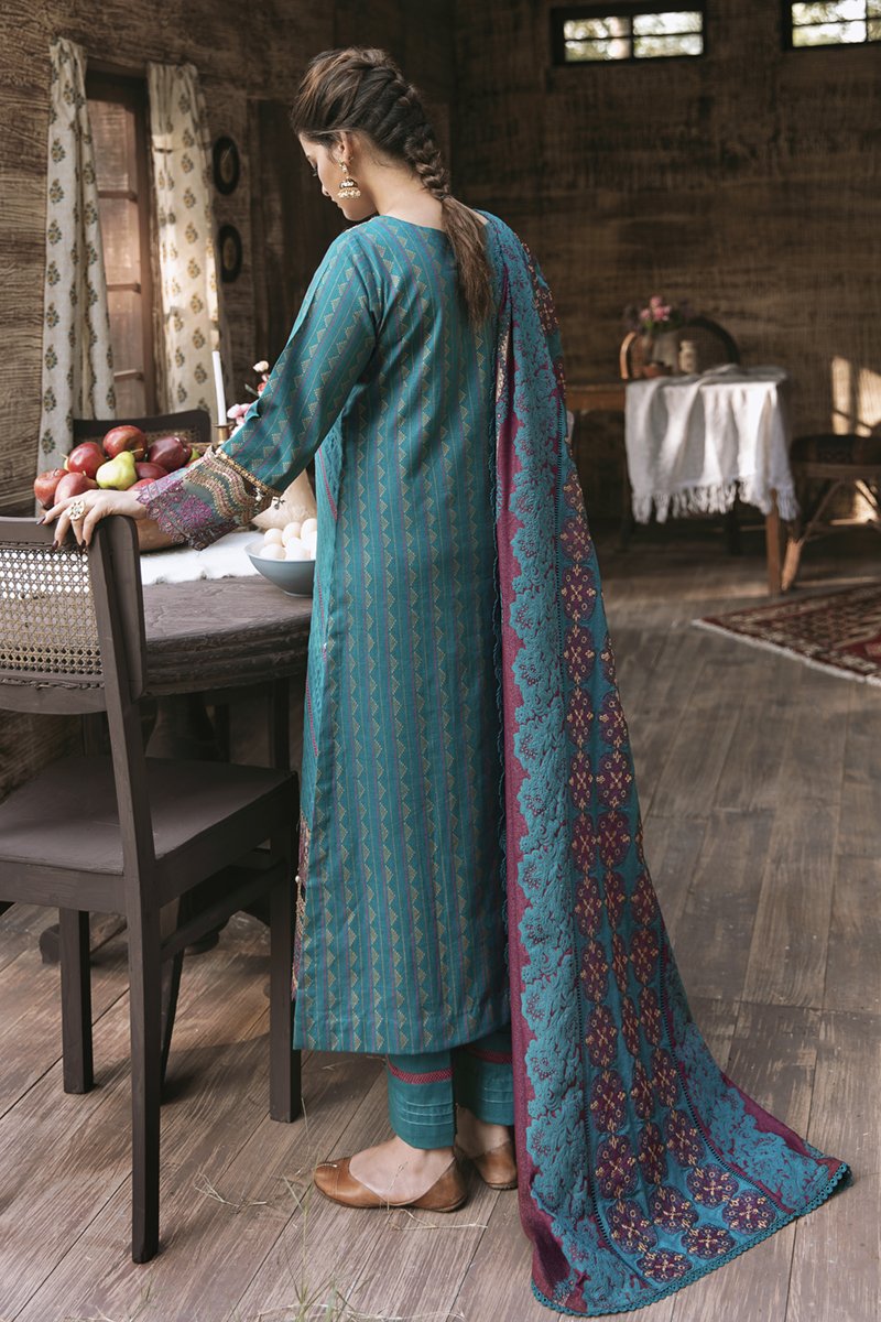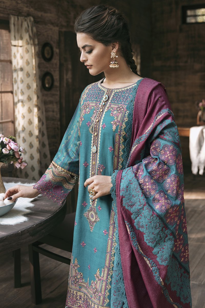 Fabric: Shirt Gotta Embroidered Neckline Embroidered Bodice Patch Schiffli Embroidered front center panel on khaddar Gotta Embroidered shoulder patch Embroidered border (Front & Sleeves) Gotta Embroidered lace (Front & Sleeves) Embroidered Front patch on Sharmoz Silk Schiffli Embroidered lace (Front) Pintucks front side panels on khaddar Block Printed (Back & sleeves) on Khaddar Shawl Embroidered shawl center panel Block Printed shawl side panel Trouser Plain Trouser on khaddar |