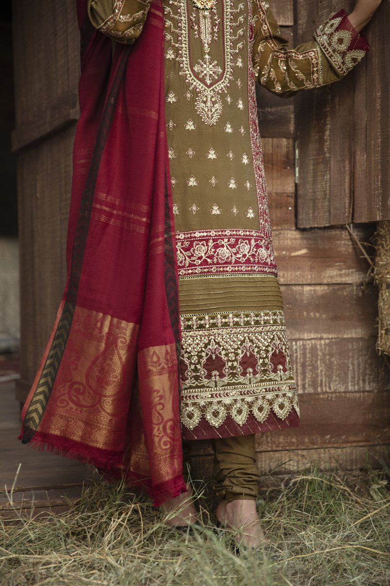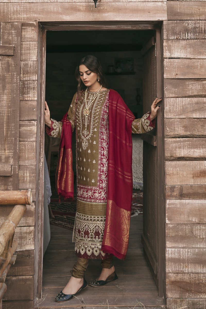 Fabric: Shirt Embroidered Front Center Panel on karandi Embroidered lace (Front ,Back & Sleeves) Chatta patti Embroidered border (Front) Embroidered lace (Front) on raw silk Embroidered (Back) on karandi Embroidered (Sleeves) on karandi Embroidered patch (Sleeves) Shawl Jacquard Wool shawl Trouser Plain Trouser |