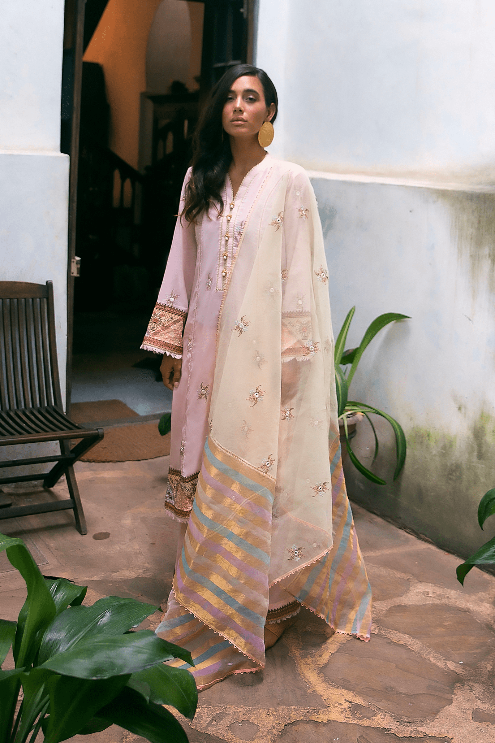Fabric: Sheesha Embroidered Front Digital Printed Back Sheesha Embroidered Sleeves Embroidered Chatta Patti Border for Front & Sleeves Dyed Trouser Sheesha Embroidered Organza Dupatta Jacquard Weaved Organza Dupatta Palu Embroidered Trouser Lace |