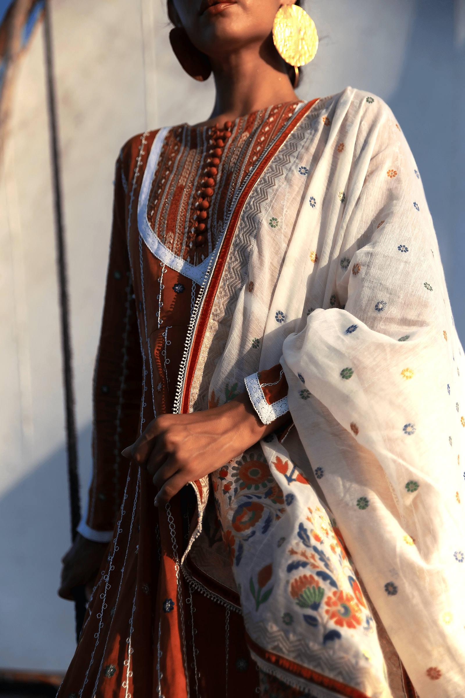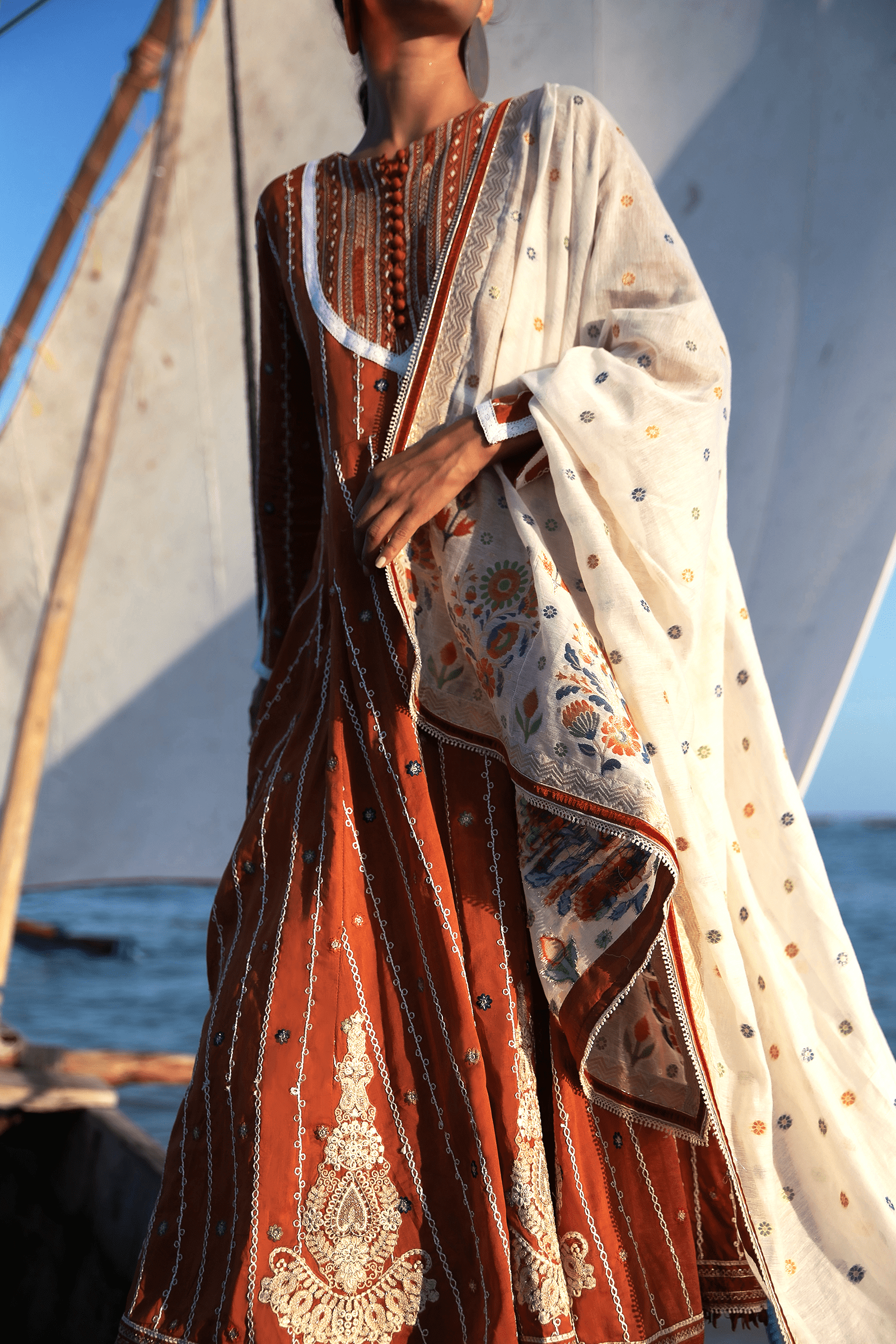 Fabric: Dori Embroidered Front & Back (4.35 YD) Dori Embroidered Sleeves Dori Embroidered Bodice Front & Back Embroidered Front Bodice Patch Embroidered Lace for Front & Back Embroidered Front Motif (x5) Dyed Trouser Jacquard Weaved Dupatta |