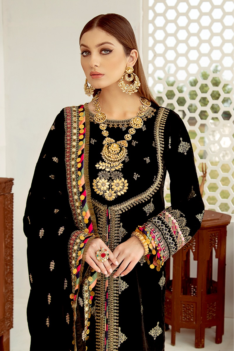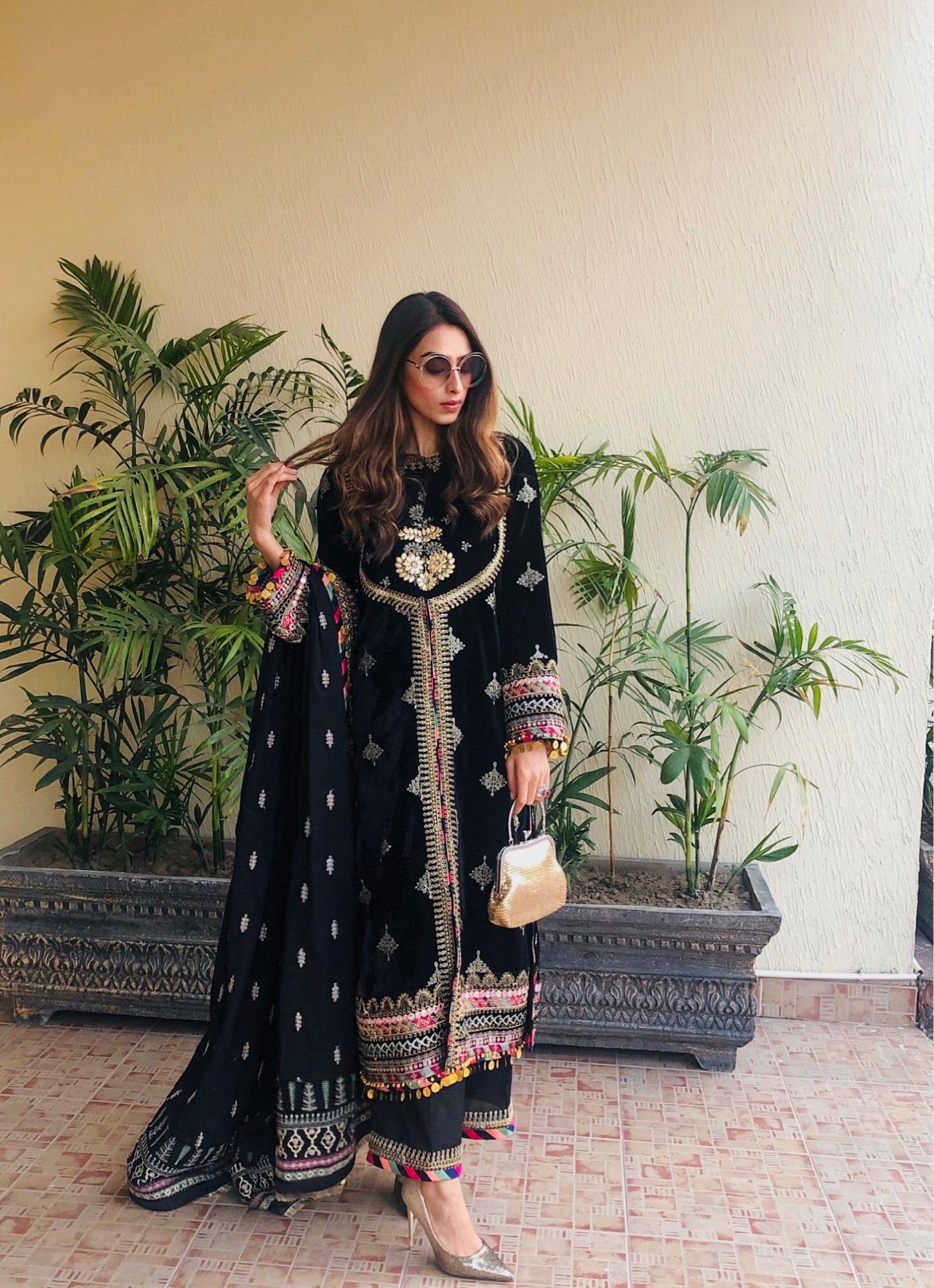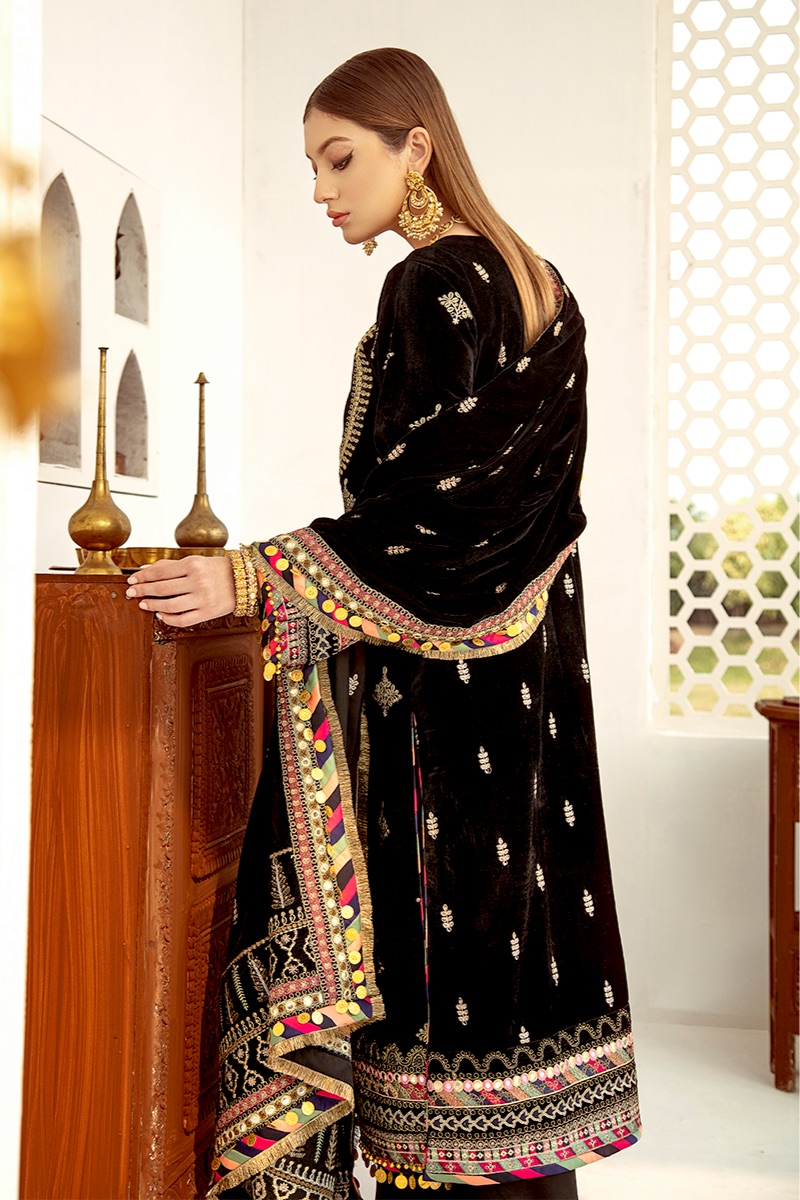 Fabric: Sequins Embroidered Front & Sleeves Sequins Embroidered Back Dori Embroidered Neckline Gota Embroidered Bodice Embroidered Lace (Trouser) Dori Embroidered Lace (Front) Dori & Sheesha Embroidered Border (Front & Sleeves) Embroidered Border (Back ) Sheesha Embroidered Shawl on Velvet Sheesha Embroidered Border For Shawl Palu Raw Silk Plain Trouser |
