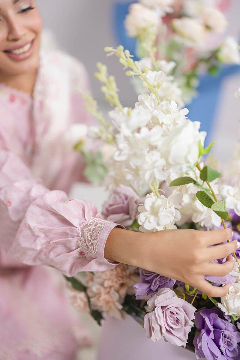 Summary: The Qalamkar Kira Lawn Suit in Pink is a delightful addition to your spring/summer wardrobe. This unstitched three-piece Pakistani suit features a digitally printed lawn shirt adorned with delicate floral patterns, creating a fresh and vibrant look. The shirt is further enhanced with an embroidered center lace on the front and embroidered borders on the front and sleeves, adding a touch of elegance. The accompanying block-printed chiffon dupatta drapes gracefully, while the digitally printed cotton trousers complete the ensemble. This versatile suit is perfect for daily wear, offering both comfort and style. Embrace the beauty of traditional craftsmanship with a modern twist and make a statement with the Qalamkar Kira Lawn Suit.
