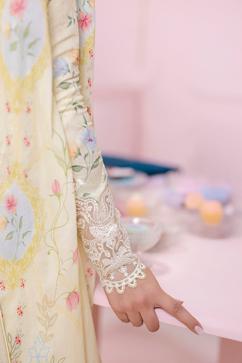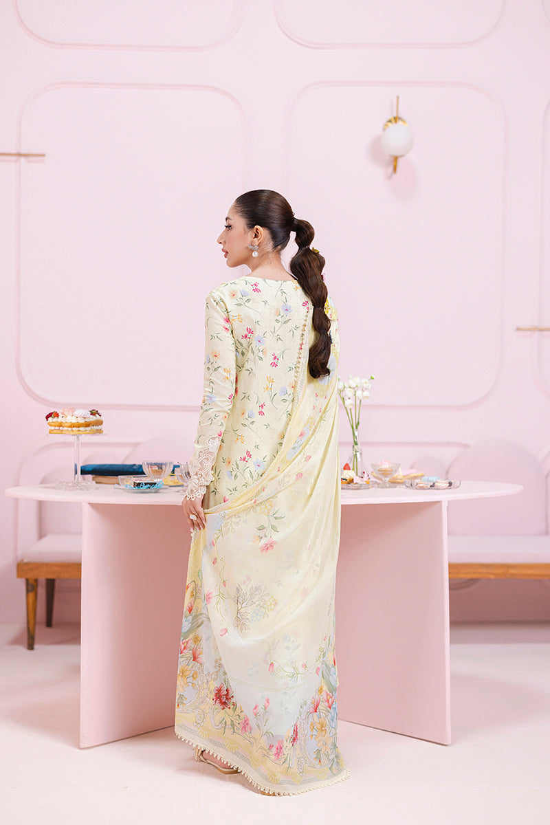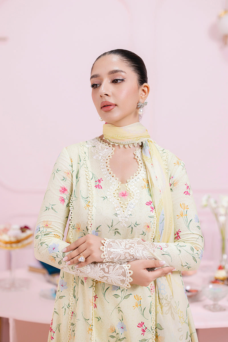 Summary: Embrace effortless elegance with the Qalamkar QPrints Lawn Vol-2 – EM-04 (B) LAUREL. This exquisite unstitched Pakistani lawn suit showcases an off-white kameez/shirt, adorned with a delicate floral print. The neckline and sleeve borders are intricately embroidered, adding a touch of traditional charm to the contemporary design. Crafted from high-quality lawn fabric, this suit is perfect for the spring/summer season, offering breathability and comfort throughout the day. The accompanying lawn dupatta echoes the floral print of the kameez, creating a harmonious ensemble. This versatile suit is perfect for daily wear, allowing you to effortlessly transition from day to night. Pair it with plain trousers to complete the look. Customize the stitching to your preference and make it a truly unique expression of your style.