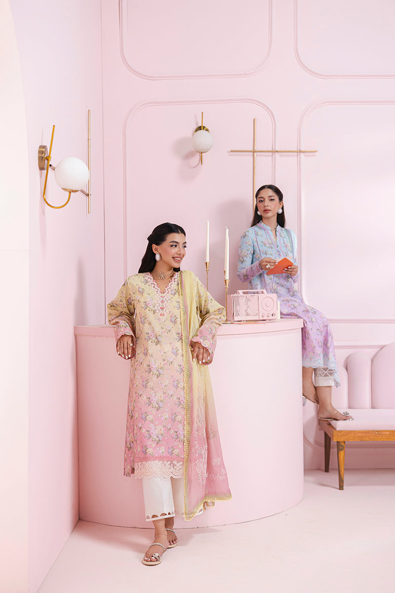 Summary: Introducing the Qalamkar QPrints Lawn Vol-2 – EM-08 (A) SIERRA, a beautiful Pakistani lawn suit perfect for adding a touch of elegance to your everyday wardrobe. This unstitched three-piece suit features a predominantly pink digitally printed lawn shirt, adorned with an embroidered border on the front and delicate embroidered lace. The lightweight and breathable lawn fabric makes it ideal for the spring/summer season. The accompanying dupatta is crafted from luxurious chiffon, showcasing a combination of digital and block prints, adding a touch of traditional charm to the ensemble. A dyed cotton trouser completes the look, offering comfort and style. This versatile suit is perfect for daily wear, allowing you to express your unique style with effortless grace. The high-quality fabric and intricate details ensure that you'll stay comfortable and stylish all day long. Experience the perfect blend of tradition and modernity with this stunning Pakistani suit. Authenticity Guaranteed - 100% Original Qalamkar product.
