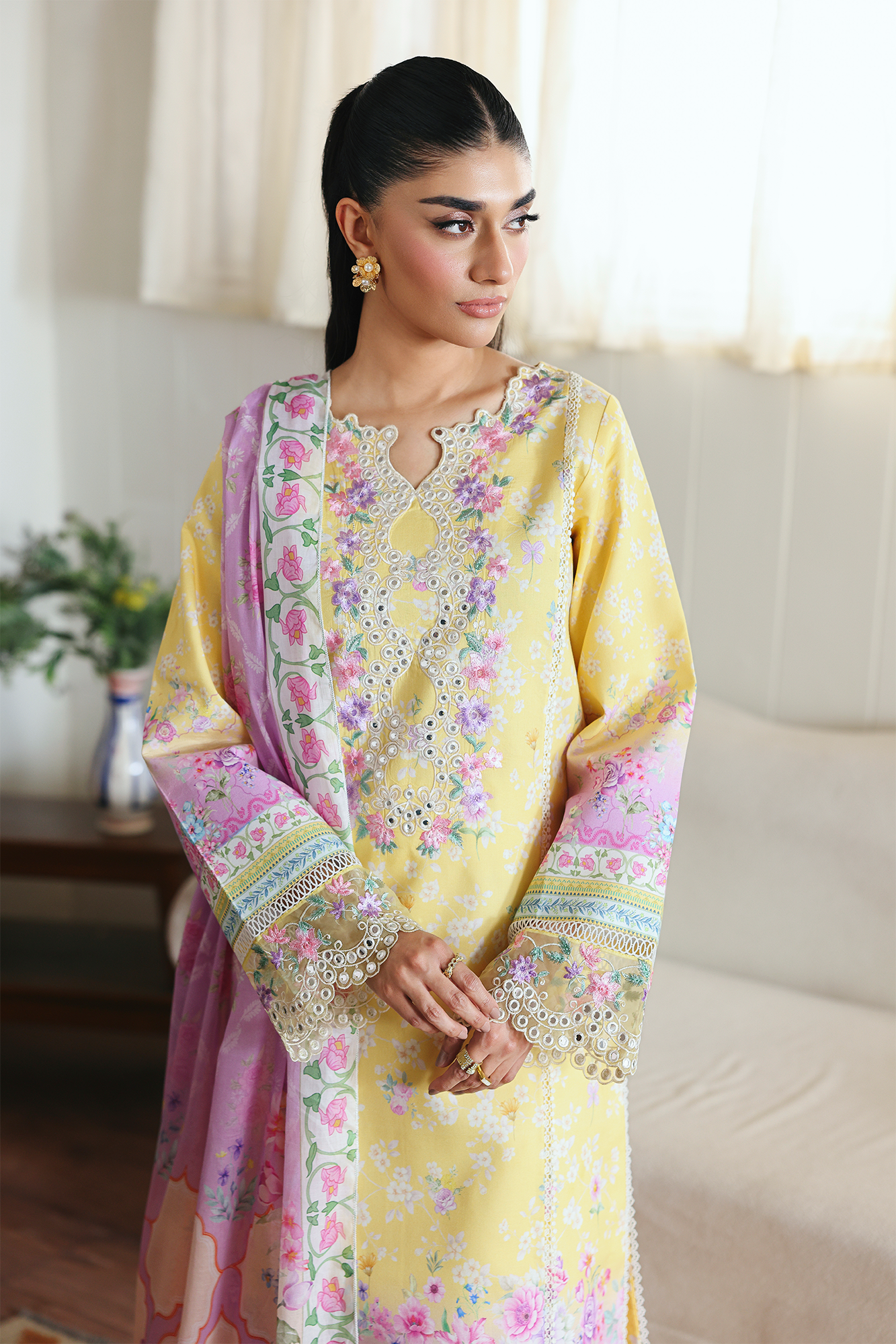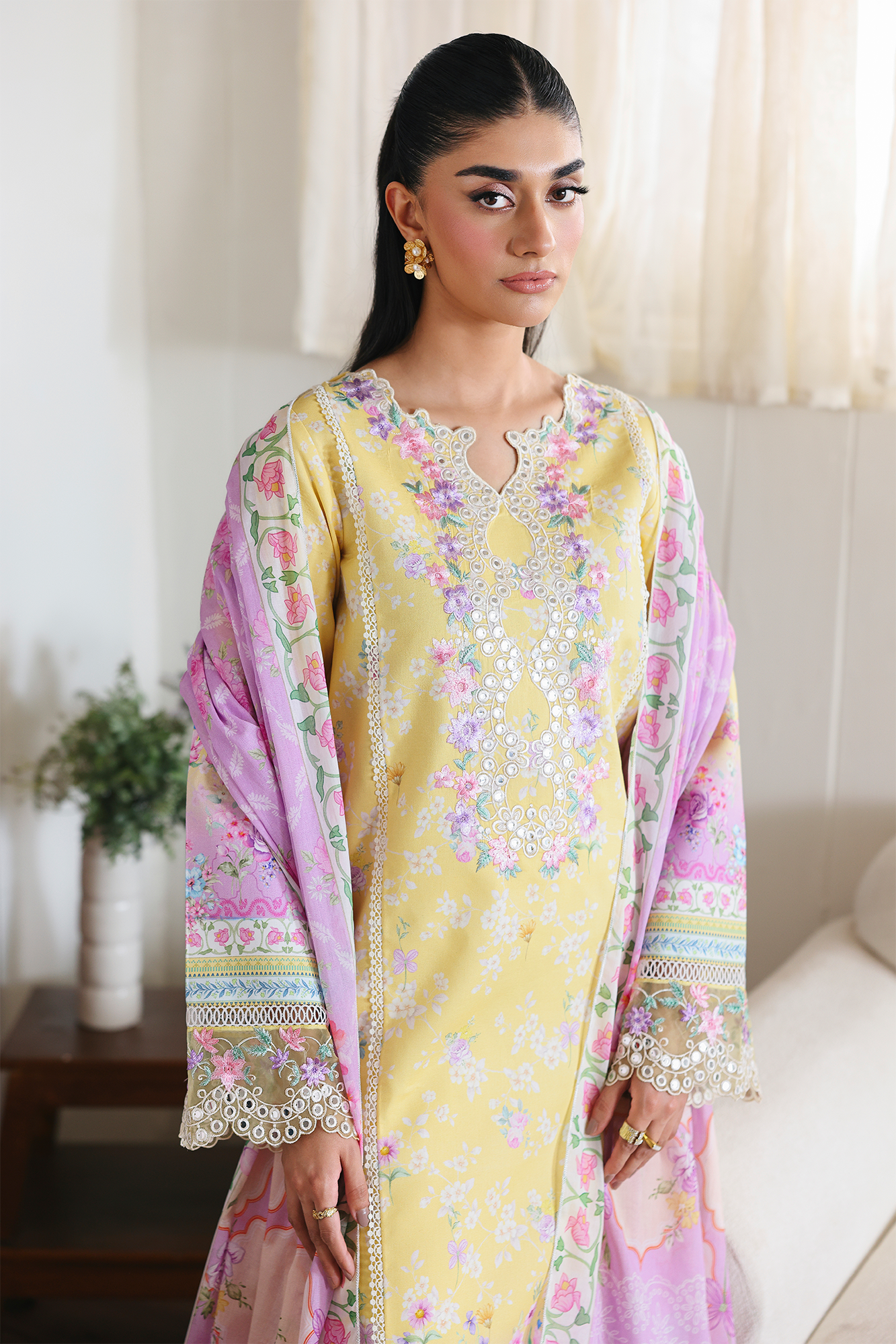 Summary: Embrace the essence of summer with the RajBari Nissa Floral Symphony Pakistani Suit. This elegant ethnic wear features a beautiful yellow kameez crafted from premium lawn, a fabric renowned for its breathability, making it a perfect summer outfit. The front is adorned with intricate embroidery around the neckline, complemented by a delicate floral digital print across the front, back, and sleeves. Embroidered borders on the hem and sleeves add a touch of sophistication. The vibrant yellow color makes this Pakistani dress a stunning choice for daytime events, festive celebrations like Eid, or even a Haldi ceremony. This unstitched ensemble offers a blend of traditional grace and contemporary style, making it a must-have for your festive wardrobe.